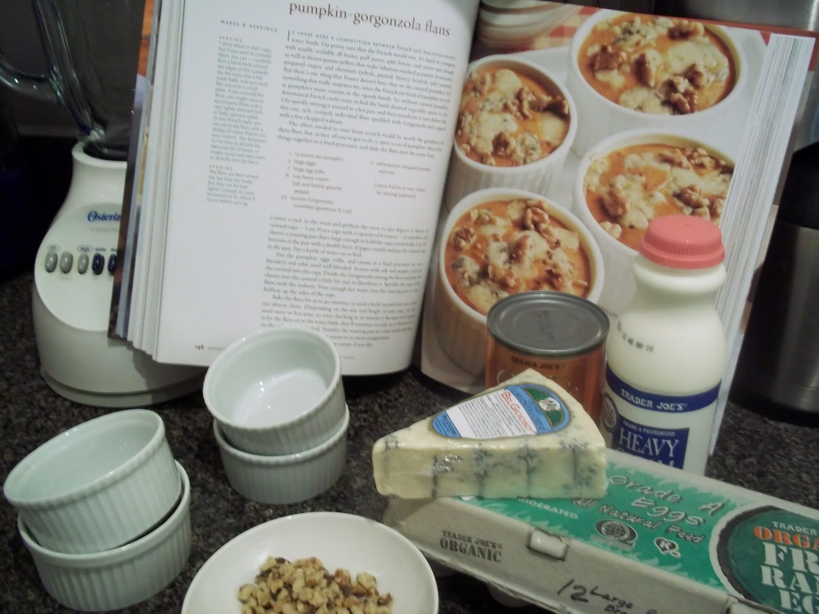 Ingredients ready to go: toasted walnuts, pumpkin, cream, eggs, gorgonzola…