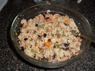 I’ve never eaten quinoa (keen-wa) before. One of my friends totally loves it, but I just hadn’t gotten around to it. So I had that in mind when I turned to make this salad. I’m afraid that it sounded a little more in the beggars linguine camp, with the combination of dried fruits, nuts and some kind of starch (and yes, I know it’s a seed, not a starch – but it kind of seems like one), so I was less than sure about it. I made this with the sincere intention of eating it for lunch. I even made another salad to go along side of it too. I did. My week go away from me…