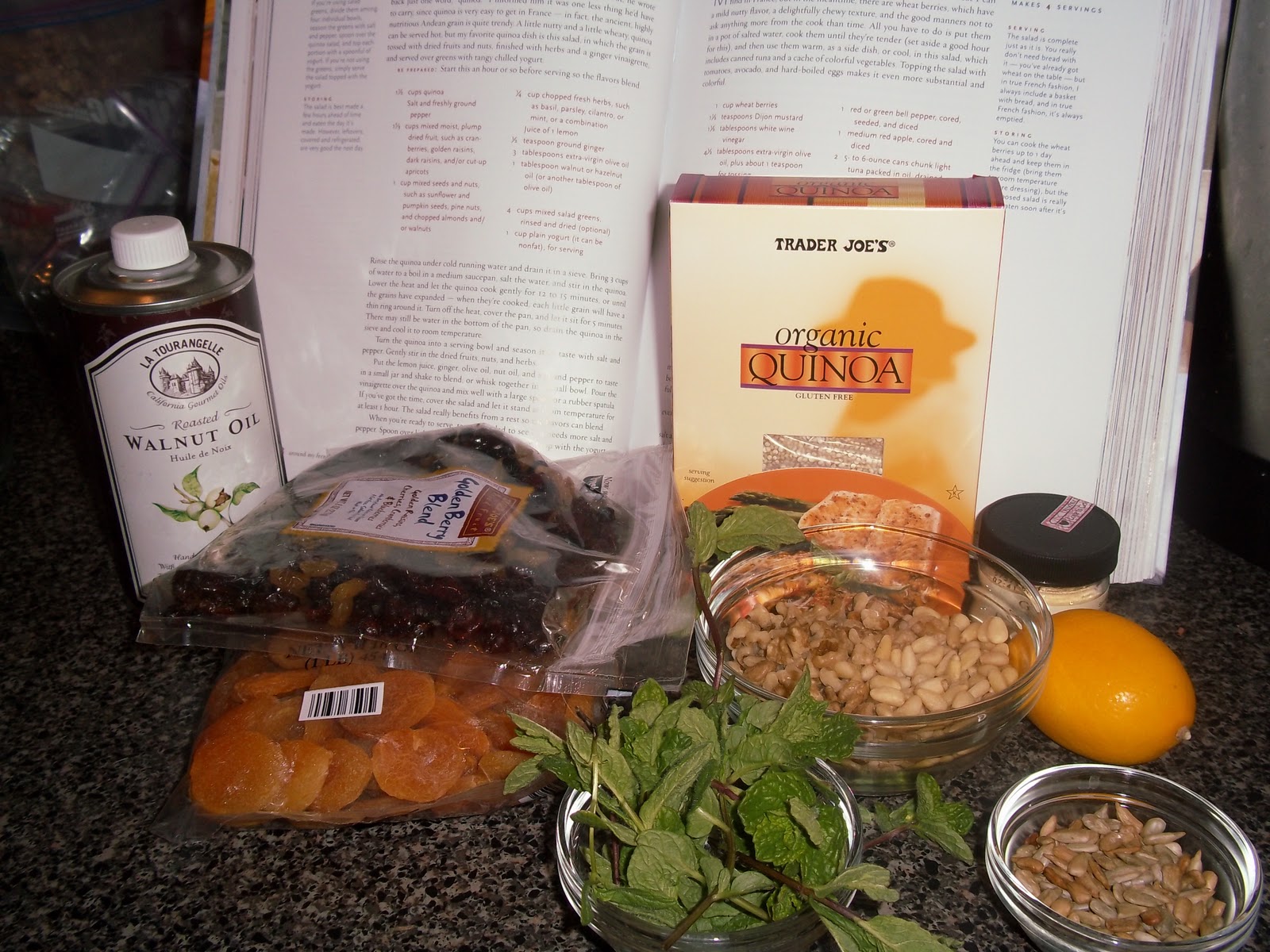 I think my general idea of making this as part of a meal of different salads had merit. I found that I liked it more as the days went by (against Dorie’s advice). Maybe I had too many nuts. Maybe the walnut oil was overpowering. Maybe I didn’t have enough other flavors in the dressing to compensate (I think some garlic, onion, or chile – or a combination – would be good). But I did kind of like that fruity-nutty combination. And it seems a shame to waste all of those perfectly delightful goodies. The mint particularly was nice with this.