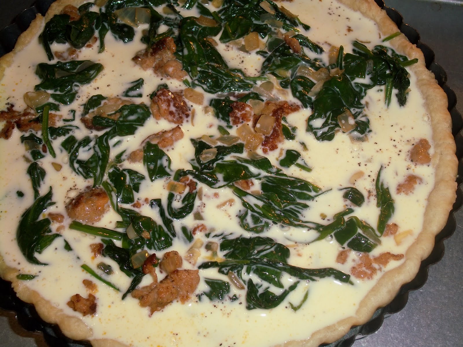 Since I was also making Hachis Parmentier for this evening’s meal, that meant that I’d have some leftover Italian Sausage. I’ve fallen in love with TJ’s chicken Italian sausage – I might never use pork again. So I thought… why not have a spinach and sausage quiche? I was already a step or two ahead, since I’d made my pastry for this, when I made it for the torteau (I think I’ll do that every time from now on – when I need one, make 2! The more times I use it, the more I like that tart crust recipe).