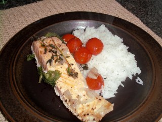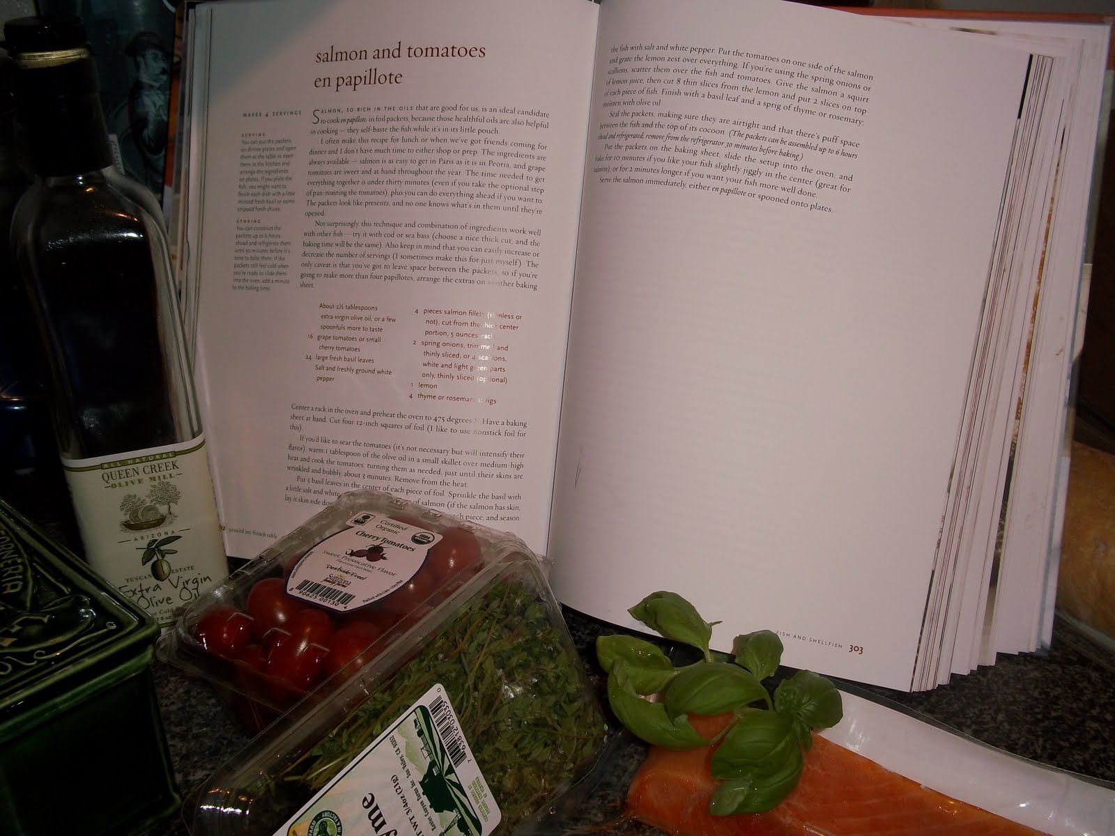 I thought that this was really a nice dish – in parts. I’m not a fan of the combination of tomatoes and salmon (don’t know why), but both were wonderful in their own way. I really, really liked the herbs and cooking method for both. And while a tiny bit (well, because of where I shopped!) expensive, a lovely mid-week meal. Or even a terrific one for that last-minute decided-to-have-guests-over weekend night. The combination of herbs, shallots, olive oil with the well-seasoned fish was wonderful. Nice, easy choice for getting back into my “racing form”.