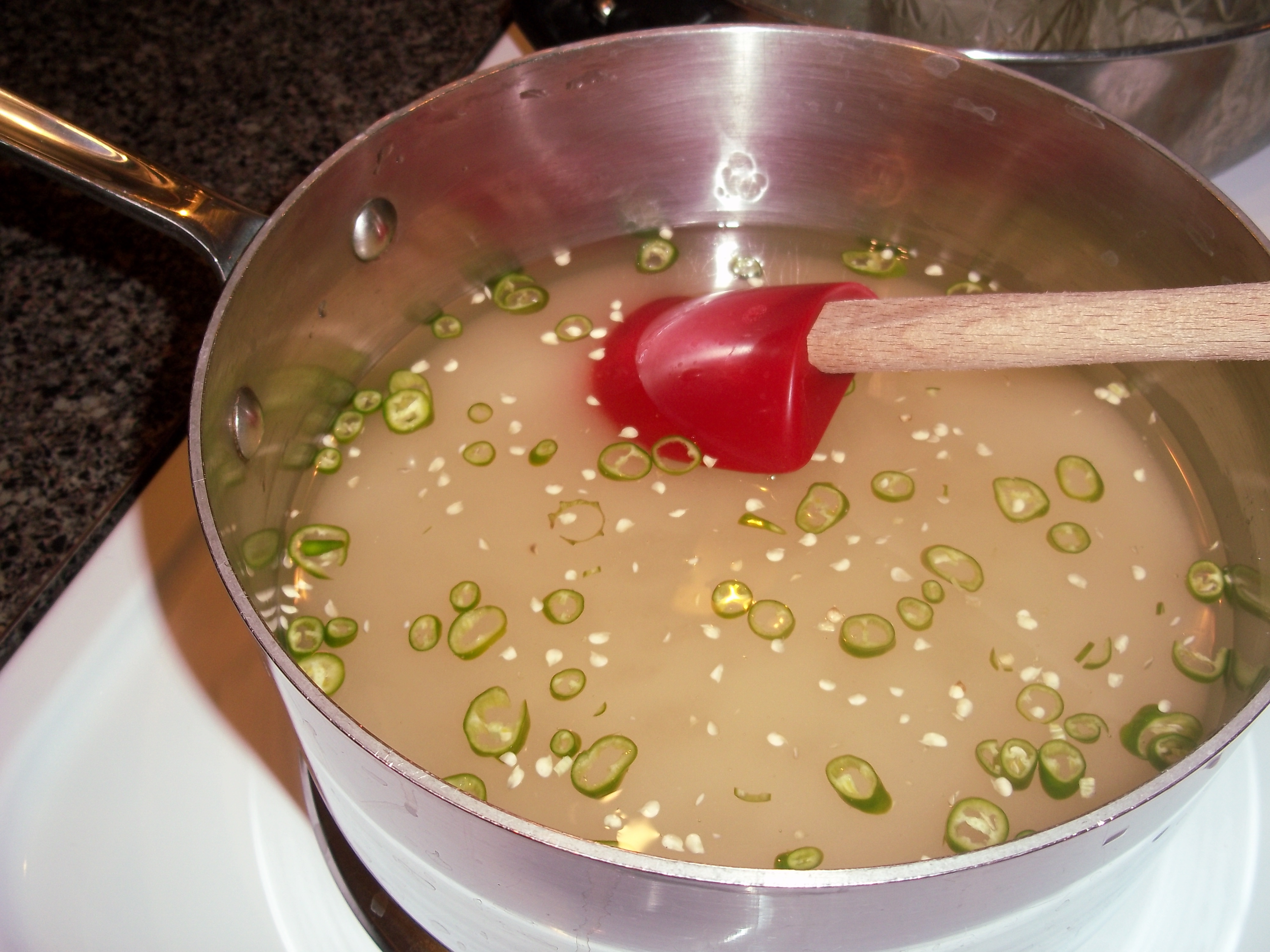 While the herbs are steeping, very thinly slice the chiles across the grain, keeping the seeds. (Do Not touch your eyes or anything else sensitive after you do this, or use gloves.) Set aside.