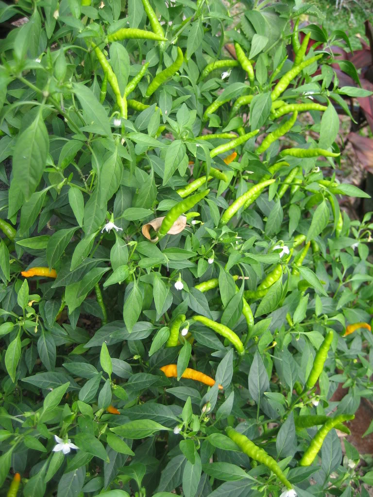 Whenever I can find cinnamon basil plants, it must be grown. Down here, I have some, but it’s still struggling. Up north, it flourishes. And I have the advantage of having people around who say – “but what do I do with it?” So I made a batch of cinnamon basil jelly. But, as summer wore on, one of the chile plants turned out to be a Thai Chile plant.