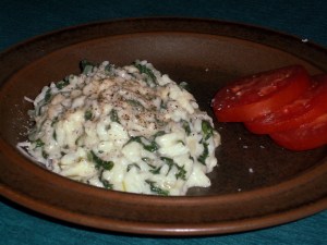 Probably the reason I’ve made this so many times is that this is a set of ingredients I often have on hand. Plus it’s easy delightful comfort food. I have to admit that the arborio rice is likely an important component (and since I’m hopeless at making risotto, this is convenient). This time, I had a really wonderful Toscano cheese that seemed like the right flavor, so I substituted that for the Gruyere that Dorie suggests. So, it couldn’t be more simple: rice, chicken stock, an onion, a couple of cloves of garlic, a package of fresh baby spinach, a bit of butter for a saute, then some grated cheese and a splash of cream to finish it off.