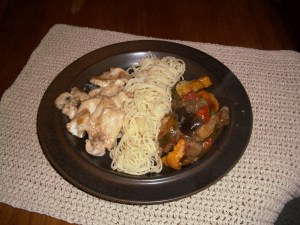 There it is… on the left. This is one of those things that is ridiculously simple, and could be made when you want something a bit “more” without actually having to DO more. Literally, you cut up boneless, skinless chicken breasts, brown in a little butter, and meanwhile mix a good dollop of creme fraiche with some crumbled cinnamon (or cinnamon ginger) cookies. When the chicken in nearly cooked, you add the cream mixture, give it a toss, and serve. What could be easier?