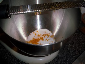 Using one of my favorite tools, the microplane grater, the zest is added to the sugar.