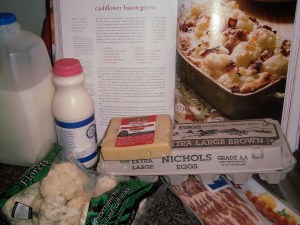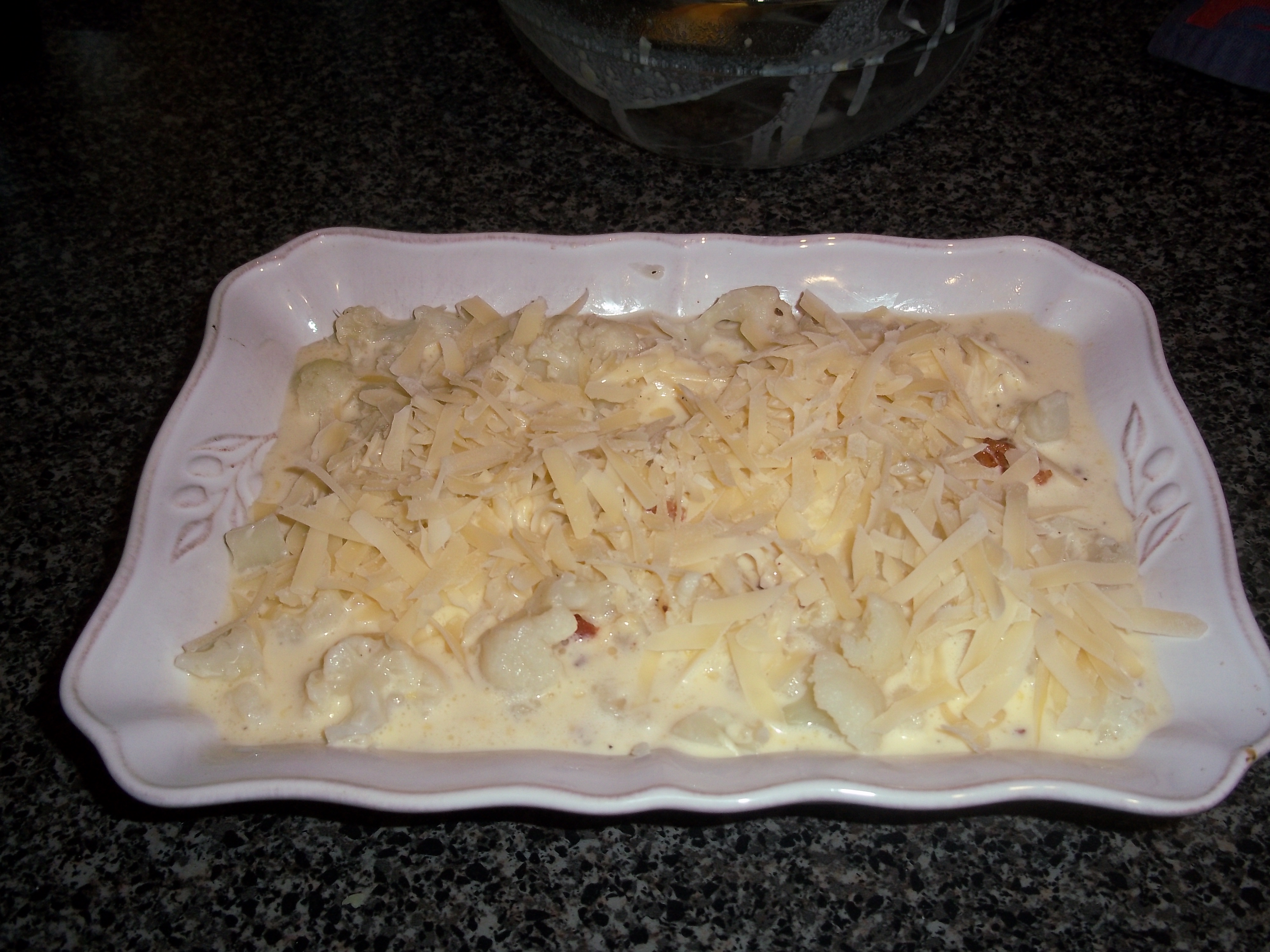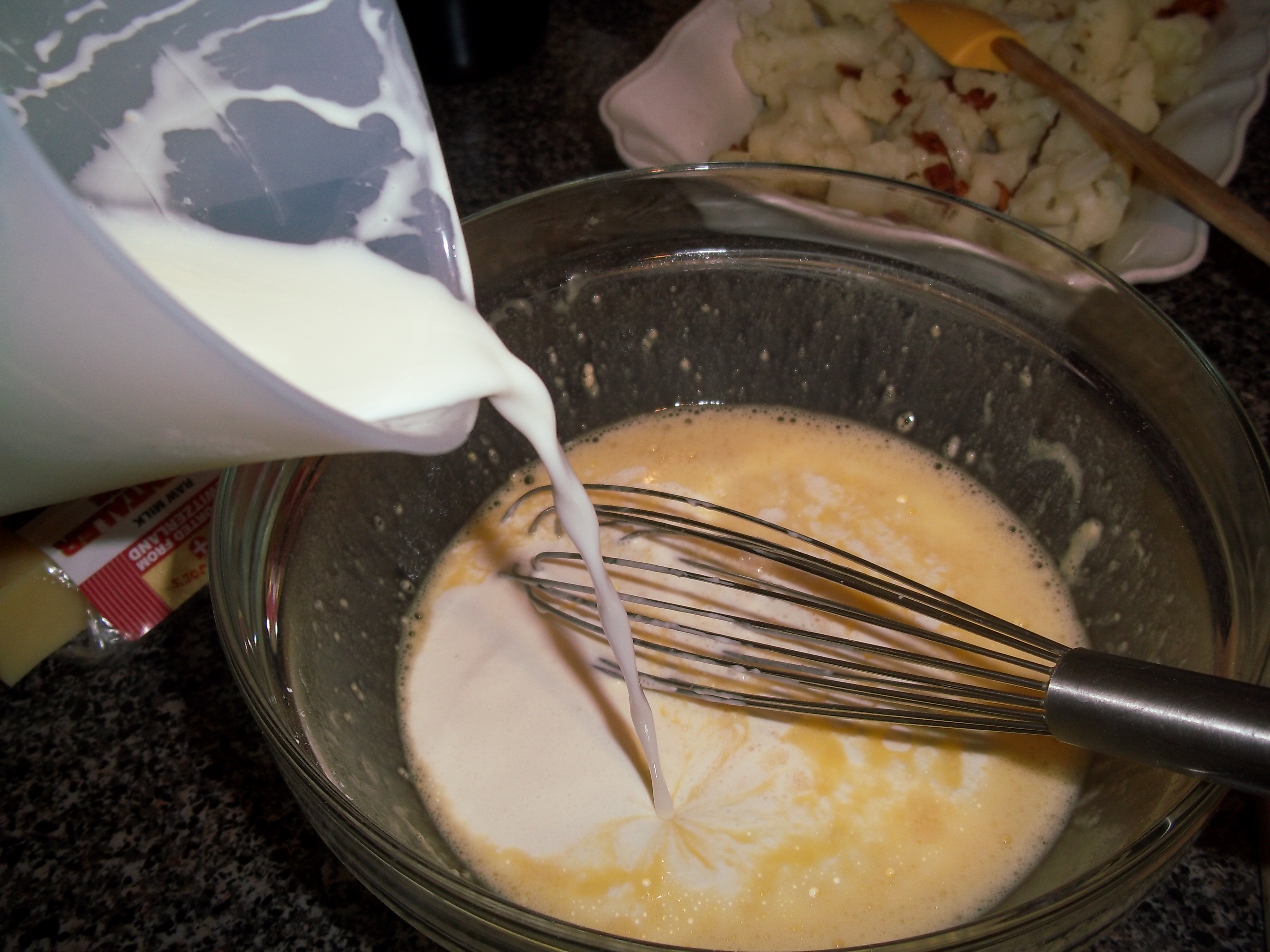 Once the cauliflower is cooked, it’s placed in a buttered baking dish. The bacon is sprinkled over, then the custard is made.