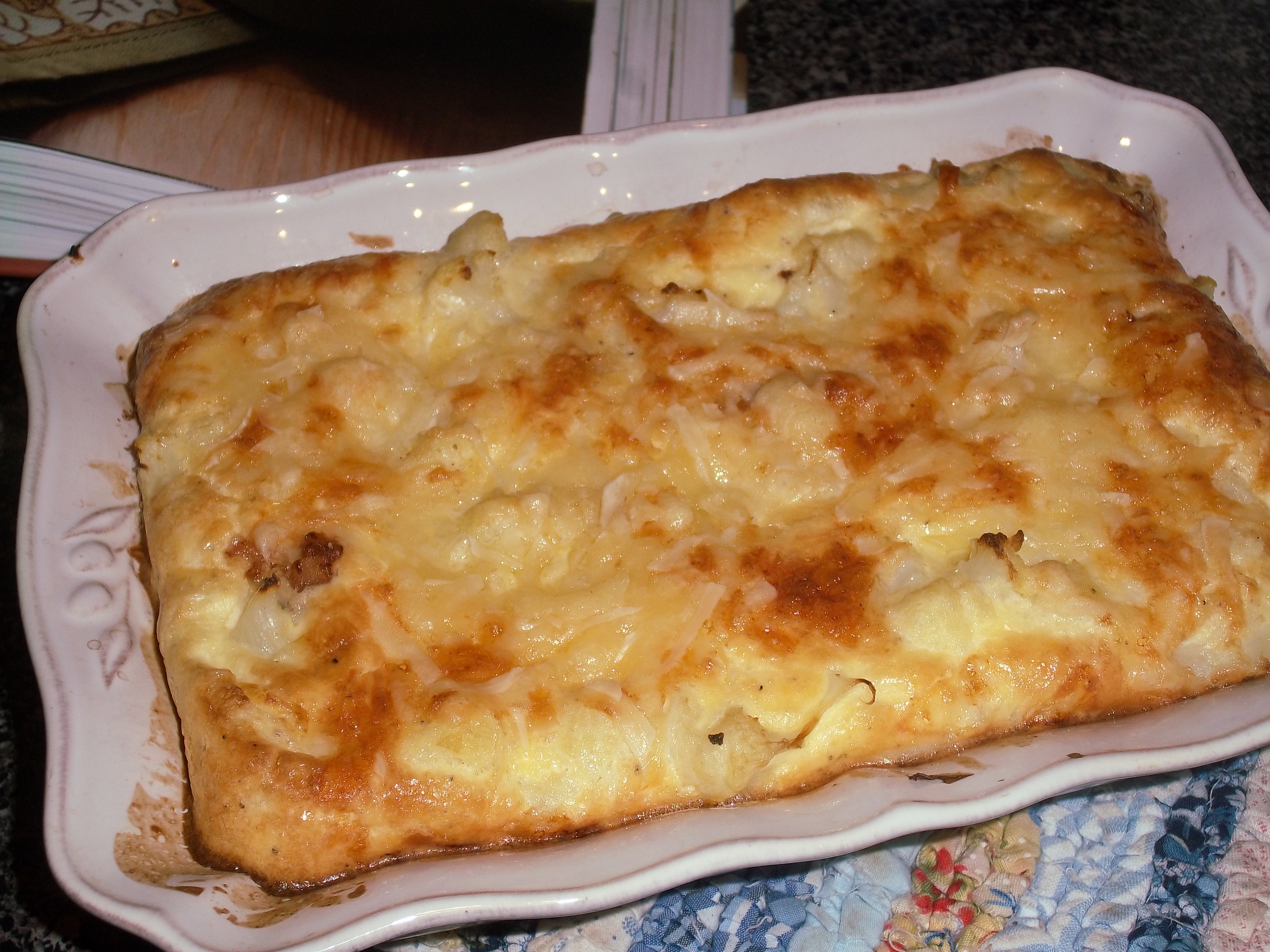 This dish is very simple, but also quite tasty. As Dorie suggests, you could change vegetables (adding broccoli would certainly make it more colorful), but this is quite nice the way it is. Some cauliflower, bacon, cheese, all wrapped in a custard of eggs and cream.