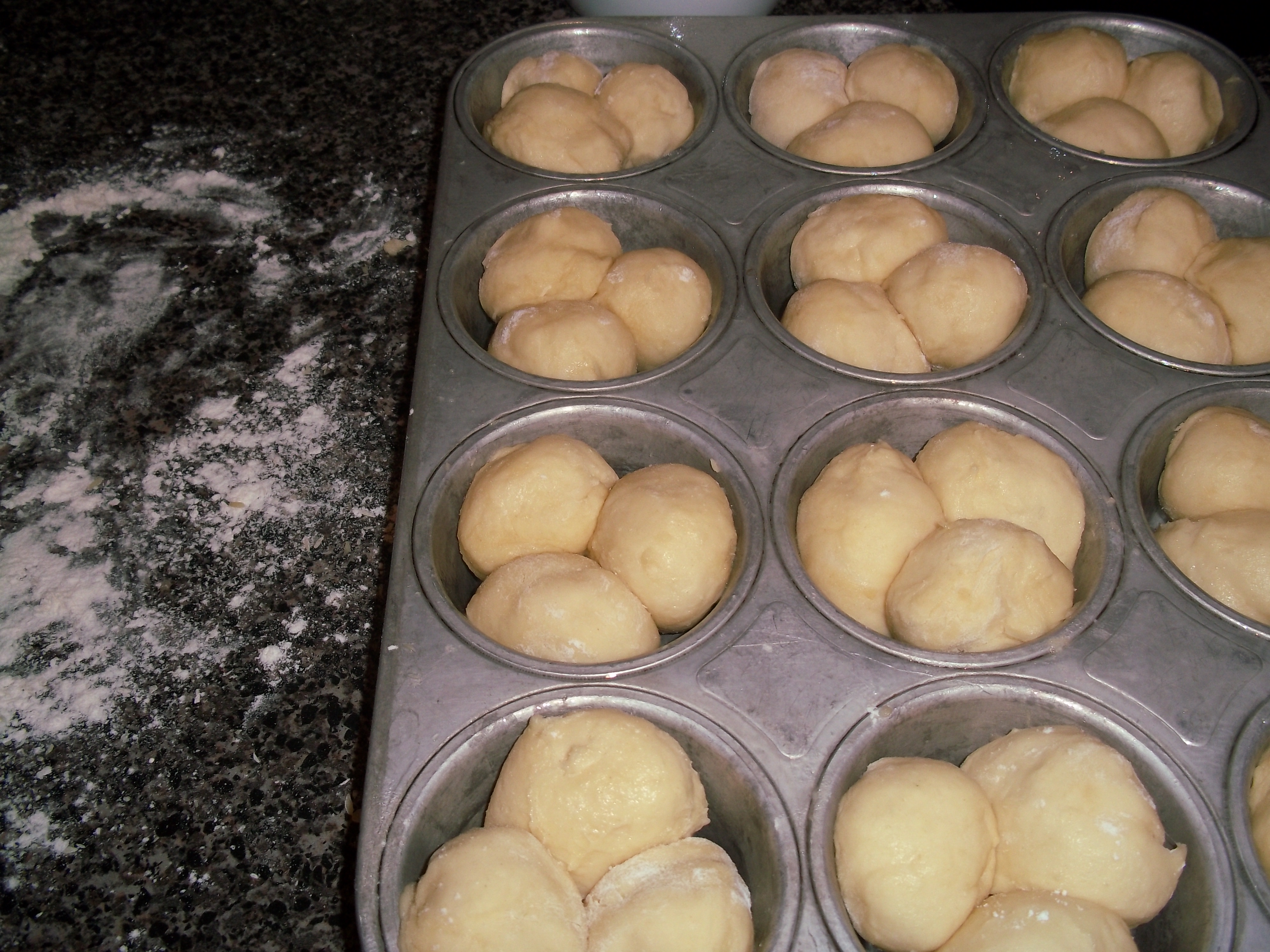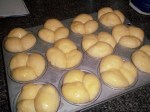 Instead of waxed paper to cover while they rose as suggested, I used a clear plastic catering top (salvaged), which works really well – you don’t have to worry about anything sticking. The rolls are lightly brushed with an egg wash once risen, and then ready to go into the oven.