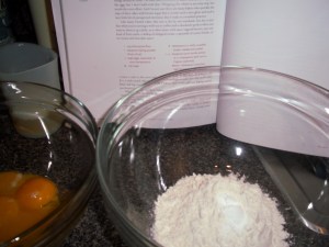 Eggs are separated, butter melted, dry ingredients whisked together. The sugar and eggs are mixed together, then the butter and flavoring added.