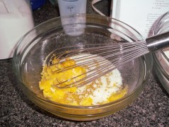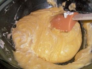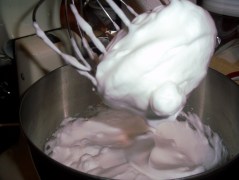 Then the dry ingredients are added to make a batter. Egg whites are whisked, and then folded in – first a portion to lighten it, then the remainder to make a light fluffy batter.