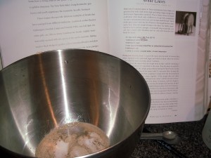 Lately, I’ve gotten into the current “dump everything into the mixer, and let ‘er rip” kind of procedure with breads, but in this instance, I thought it would be fun to follow the process as written. Initially, it’s just the yeast, water, a bit of the sugar and salt into the bowl to let it all soften.
