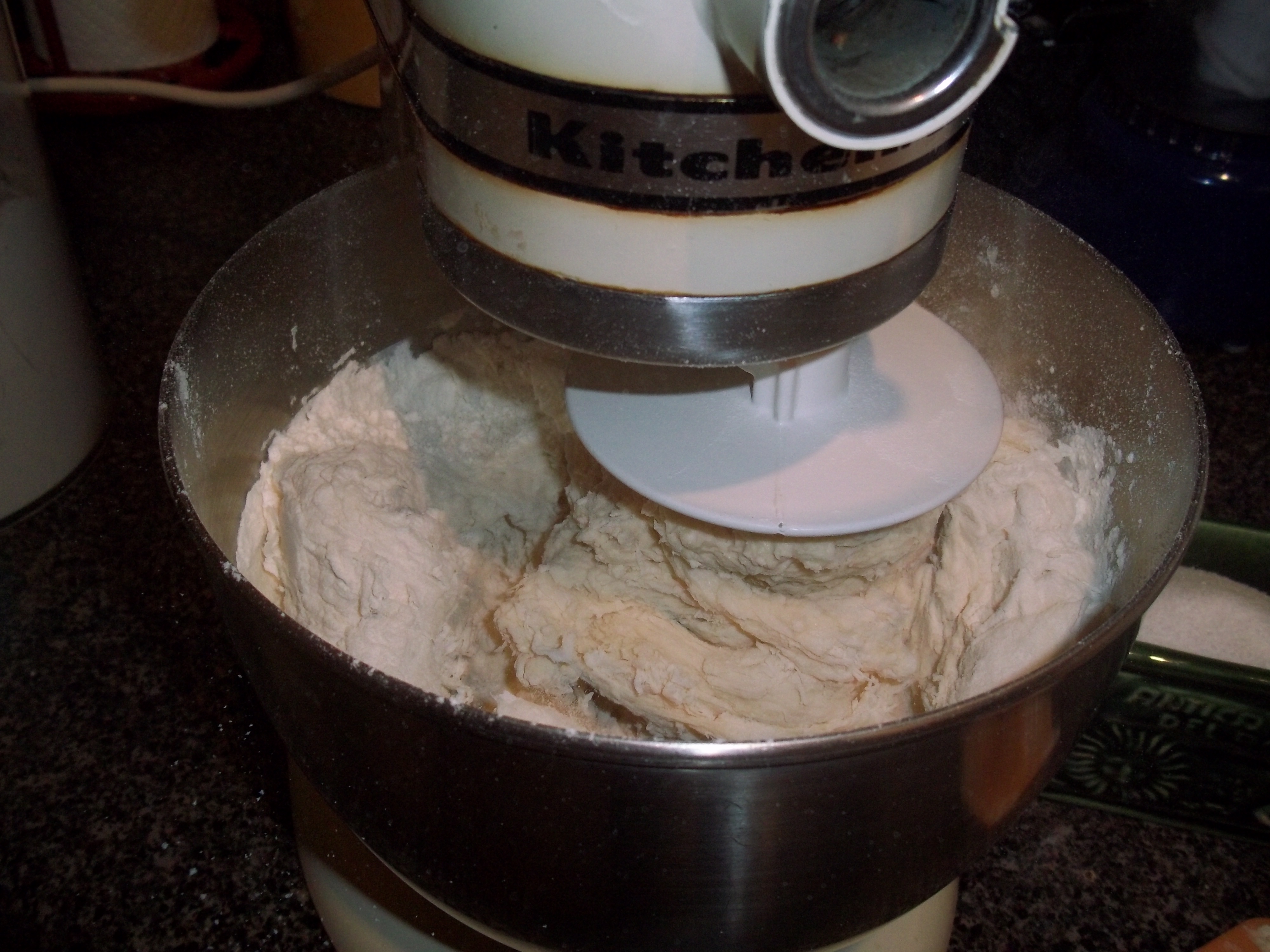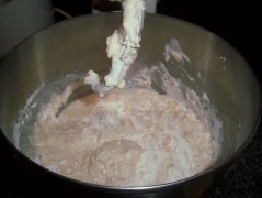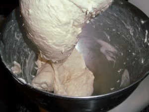 Then, half of the flour is added to get things started. It doesn’t look promising, but have faith – it will come together! The second half of the flour is added, to make a dough.