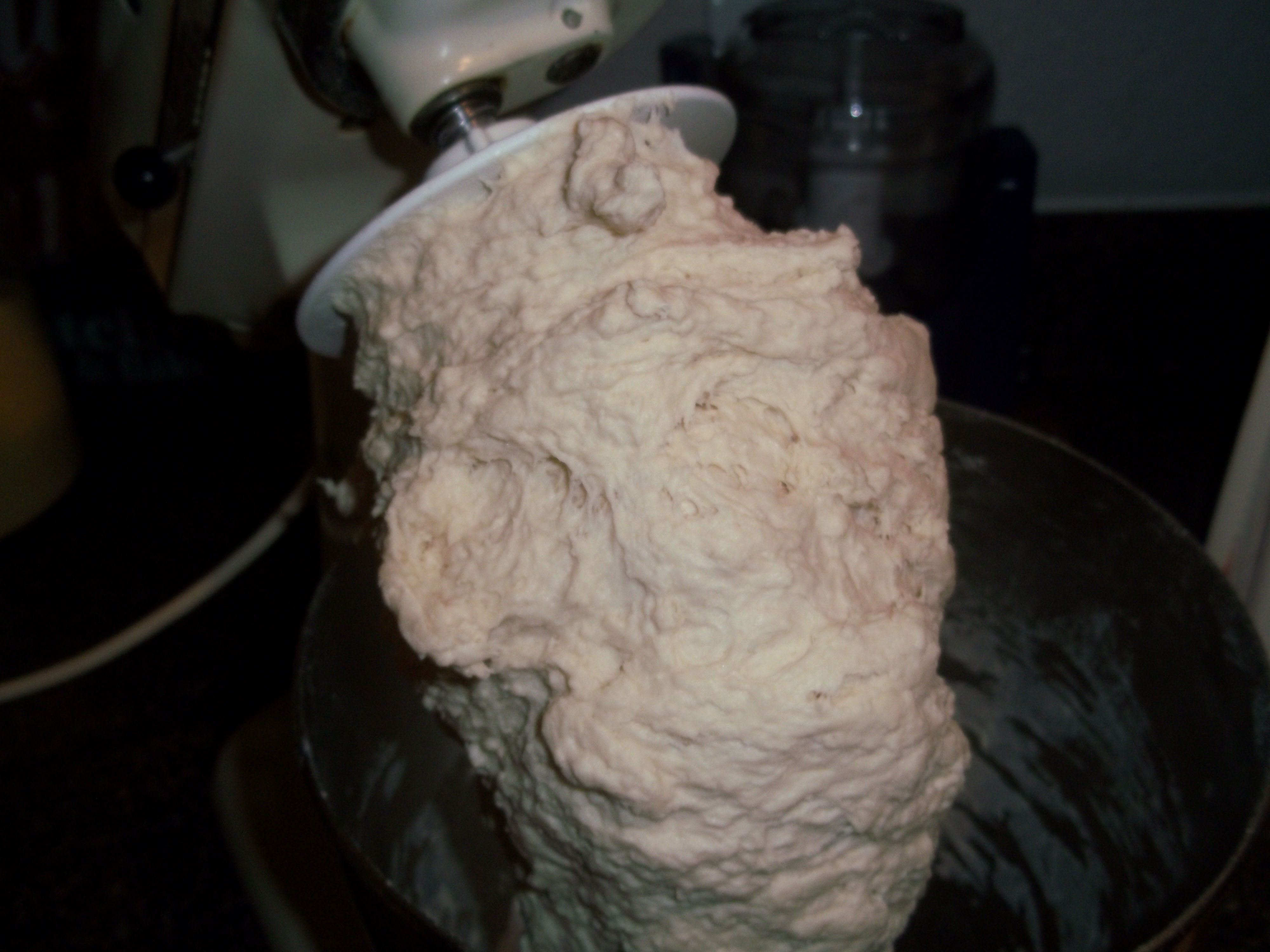 Now, the magic of modern appliances comes into play (OK, so, my Kitchenaid is over 30 years old – older than this cookbook, but still…). The dough gets kneaded for about 8-10 minutes more. It ends up looking like this.