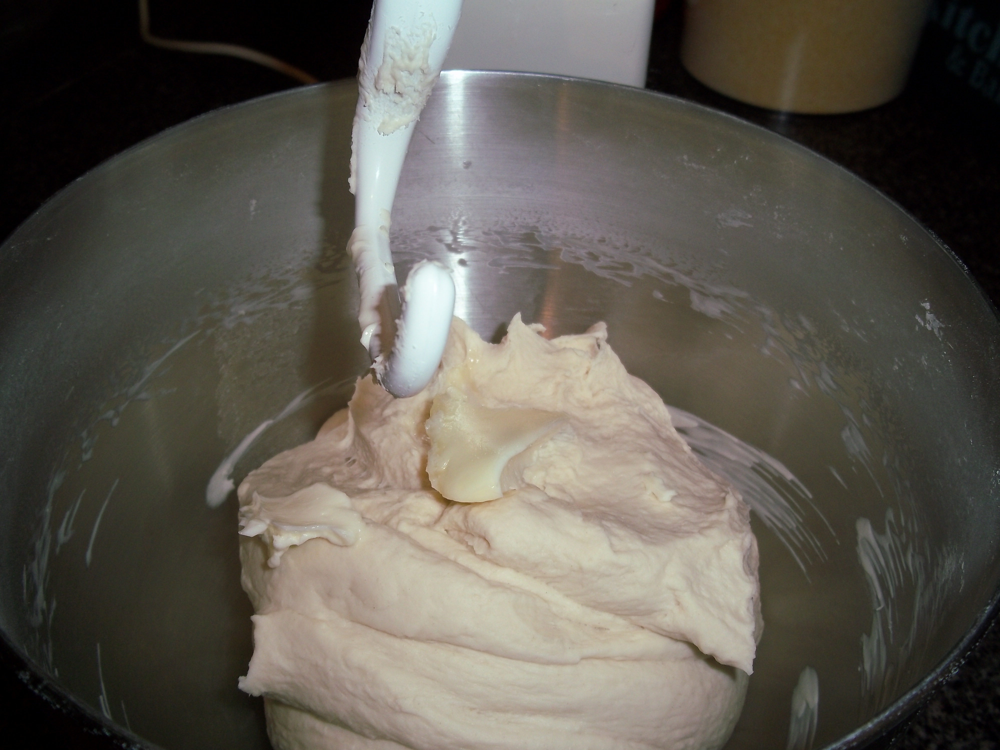 But we’re not done yet. Unlike my grandmother’s recipe, the butter is added later, and a tablespoon or so at a time. Luckily, Baking with Julia warns us that our beautiful dough is likely to separate! I’m not sure why it’s done this way – I’d love to know what the reason is.
