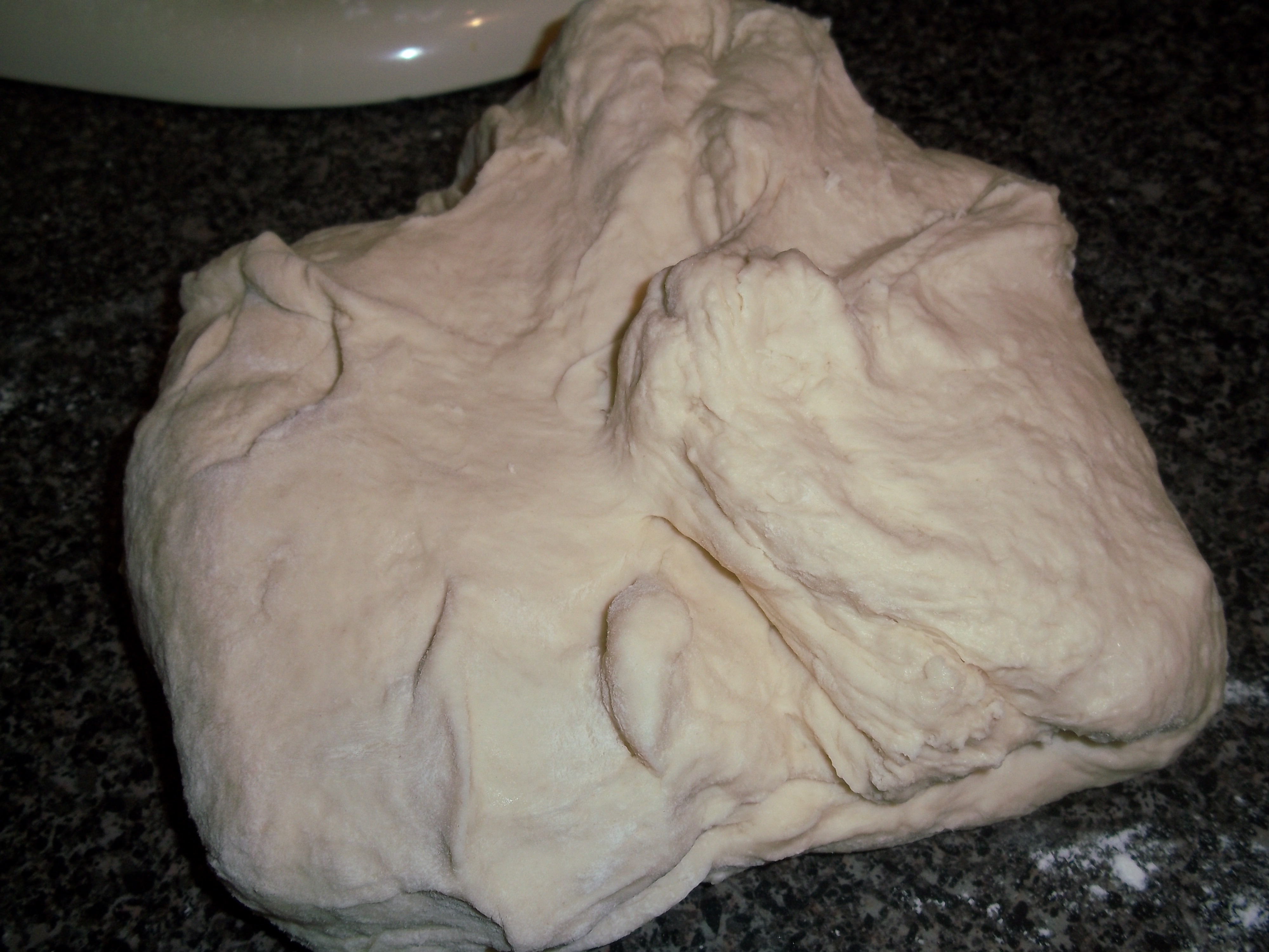 Eventually, it becomes a beautiful bread dough again, and all is saved! Back in the day, I used to get all worried about not kneading bread dough by hand, as if something elemental would be missing. Those days are gone, though I admit I will still spin it a turn or two if the mood strikes. Once it’s in a nice ball, it’s placed in a greased bowl – I put it “pretty side down” to take care of the top, then turn it over to rest.