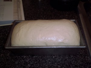 Then, it all gets plopped into a prepared loaf pan. As you can probably guess, maybe a bit unevenly, but oh well. The loaf got covered to allow a nice rise. The other half got placed into a bag in the freezer… you’ll find out more about that later!