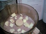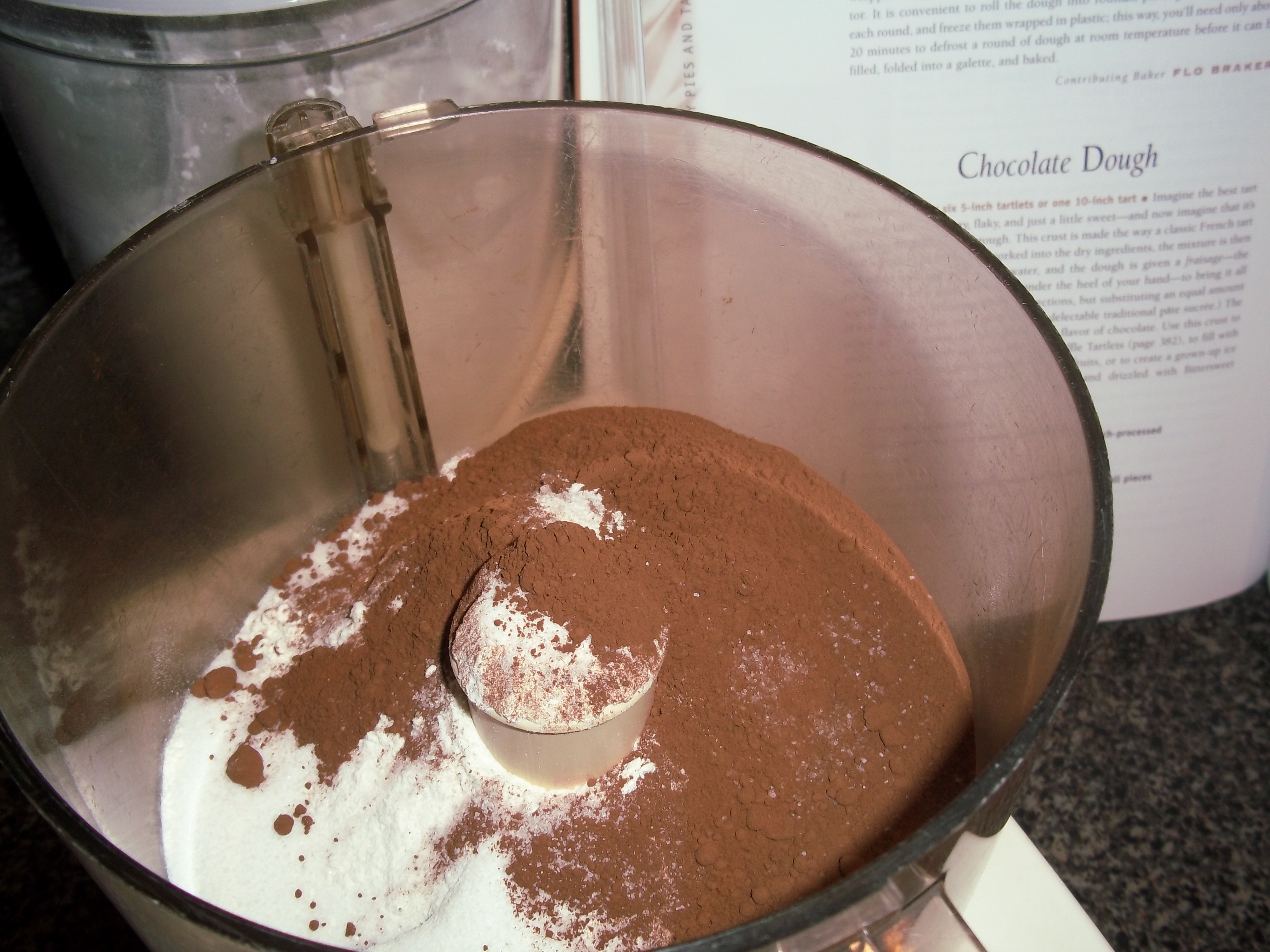So, to begin, the chocolate tart dough is made. There are a number of steps, whirling the dry ingredients in the food processor (no, I’m not making this by hand), then adding the butter, and finally an egg yolk mixed with some ice water.