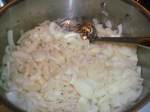 Dorie provides a method for slicing the onions – I tried it… then quit. Mine were purchased from a local market at a bargain, but they hadn’t been really sanitized. I decided I’d rather pre-emptively get rid of the dust in the root end, that she suggests leaving on for slicing.