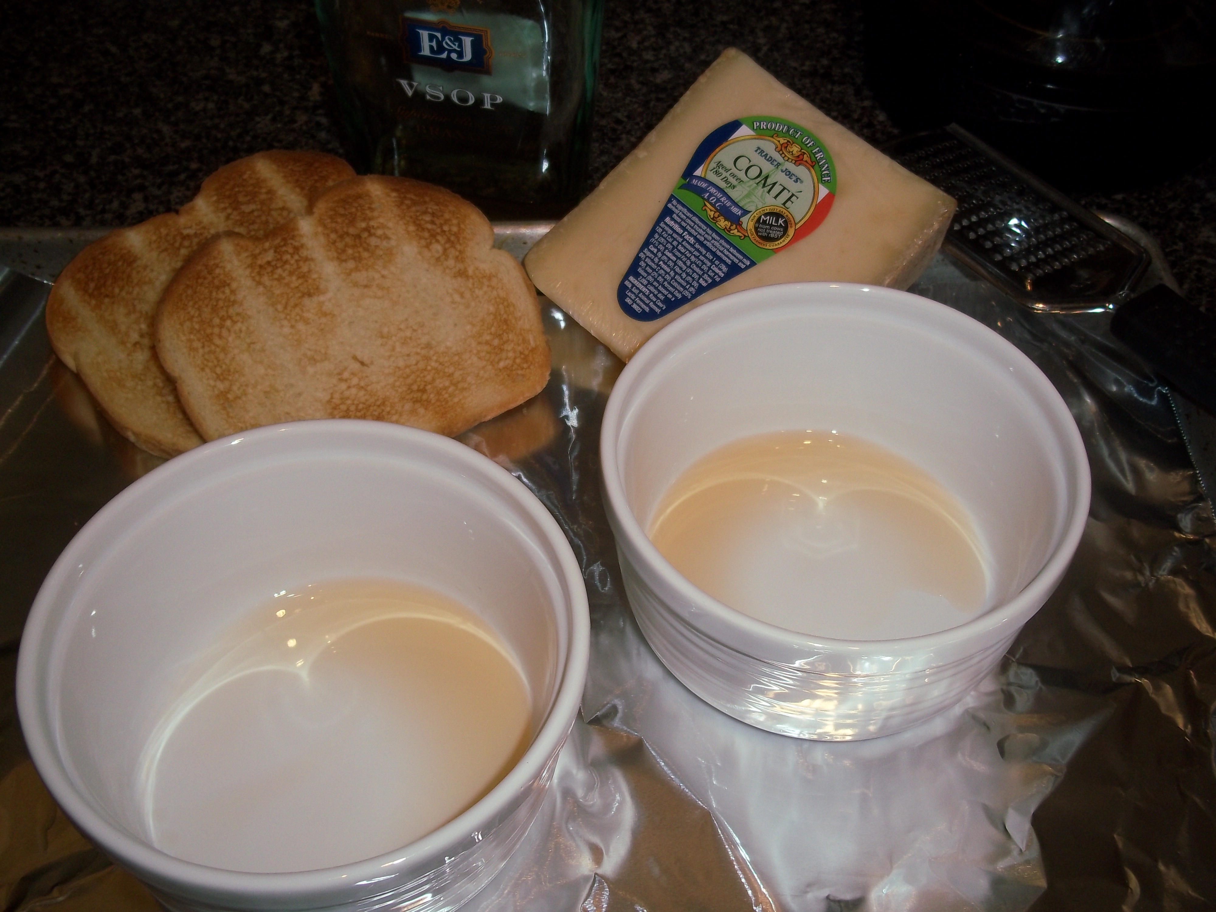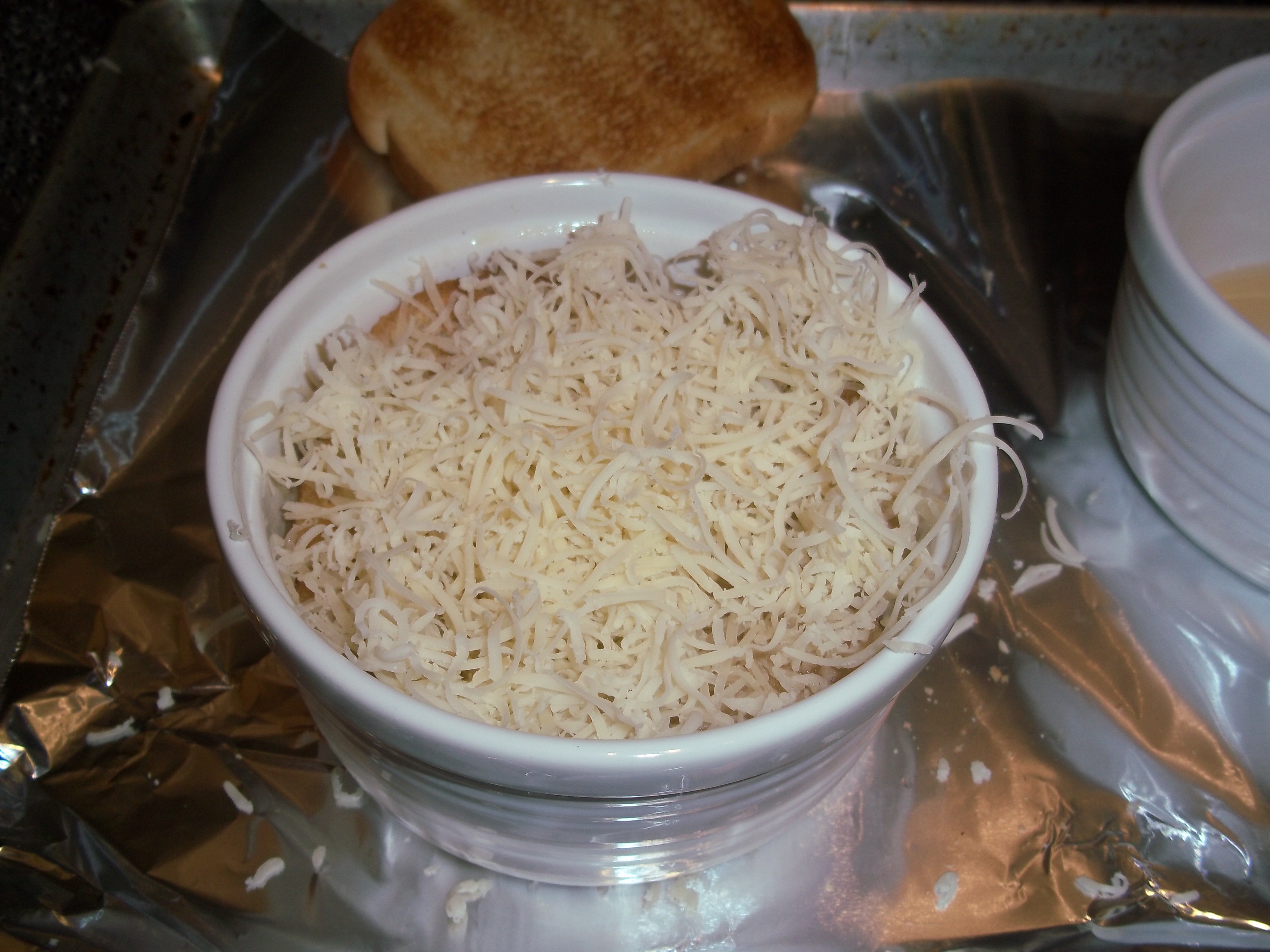 Once that’s had its simmer, it’s time for the topping part. In the recipe it talks about broiling both sides of the bread – sure, I did that – in the toaster. I used comte cheese, as suggested which was perfect (one of my new favorites thanks to Dorie). A bit of cognac is added to each bowl as well for another layer of flavor.