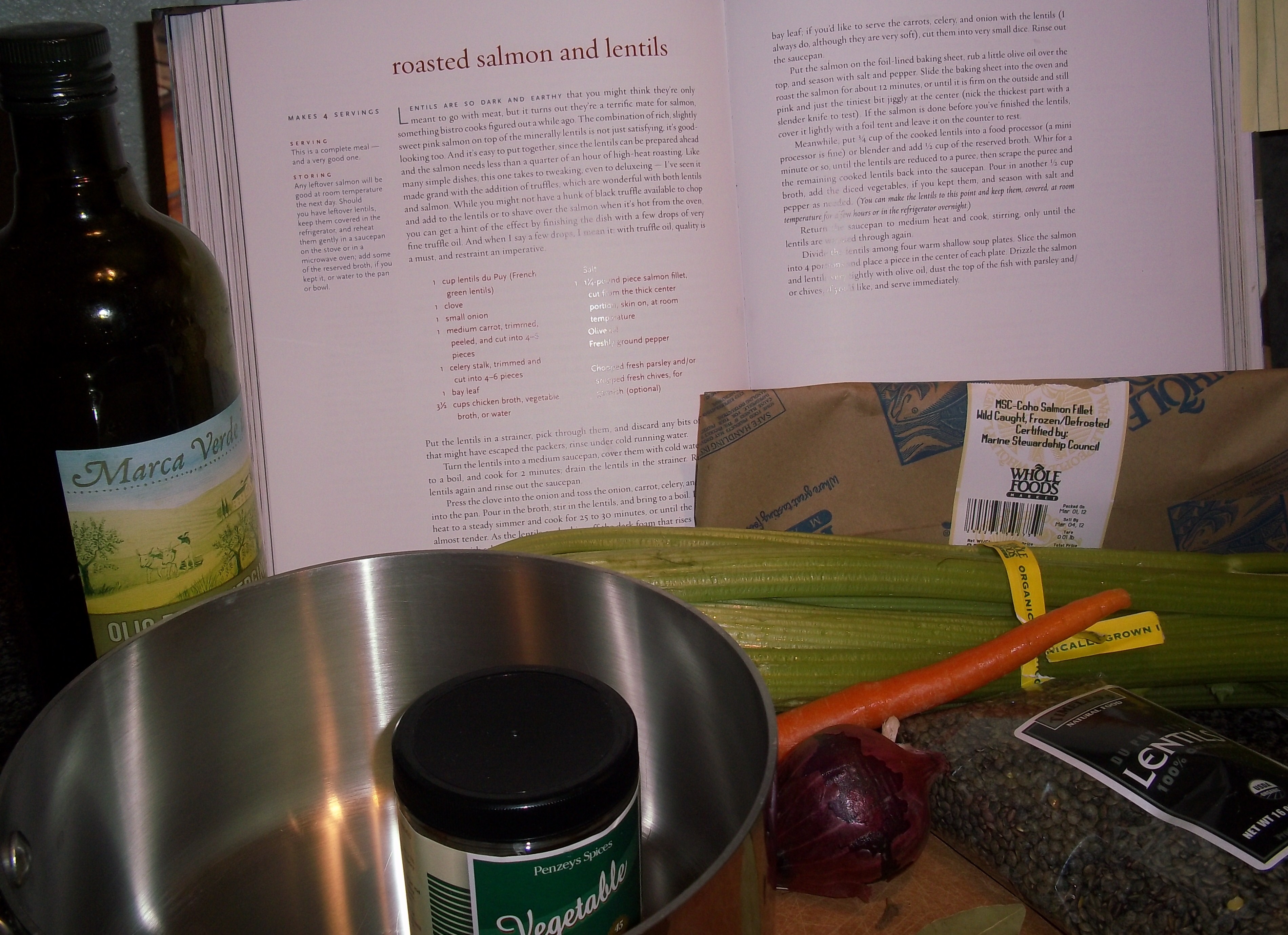 The ingredient list is short and manageable. I was able to find some wild coho salmon and the rest of the ingredients are pretty standard. I also used my Penzey’s vegetable soup base so that the lentils would be a meatless version.