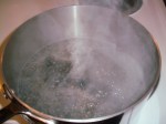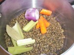 The lentils have a quick pre-boil, then are combined with the vegetables, stock and bay-leaf.