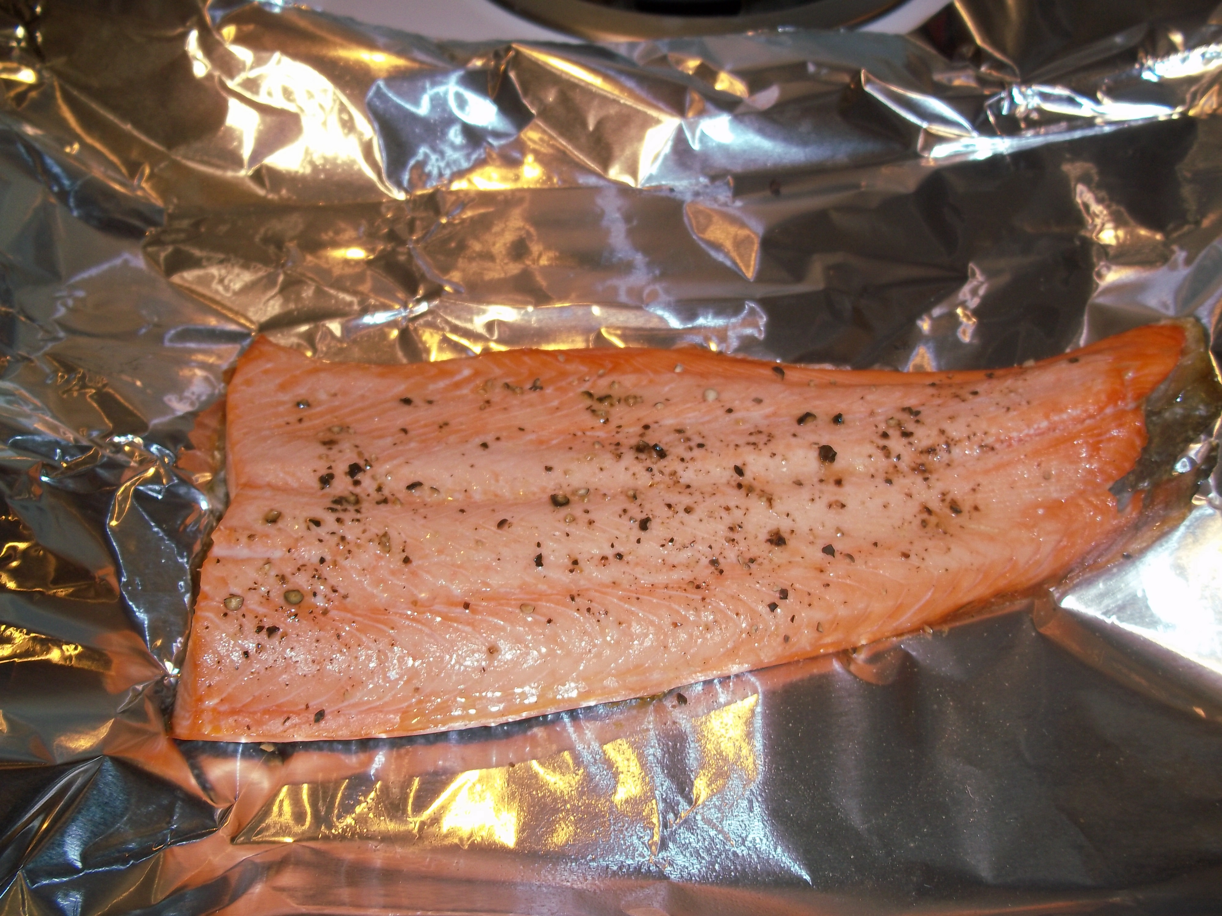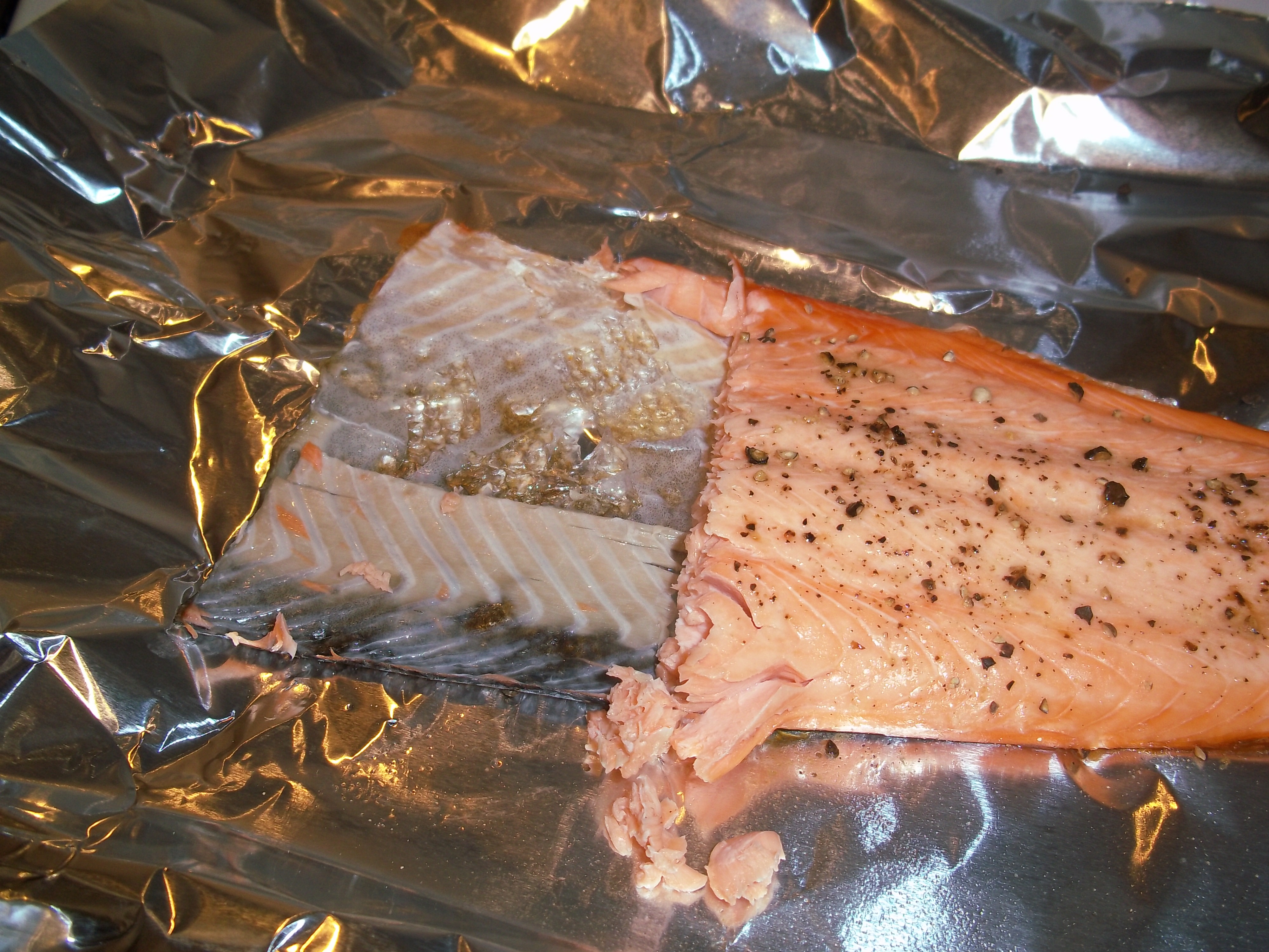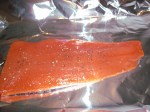 While that all cooks, it’s time for the salmon. There’s essentially nothing to it – a bit of olive oil, salt and freshly cracked pepper. One thing I did think worked well was that  the skin on the salmon as it’s baking keeps the salmon moist and also sticks to the foil so it’s easily removed for serving.