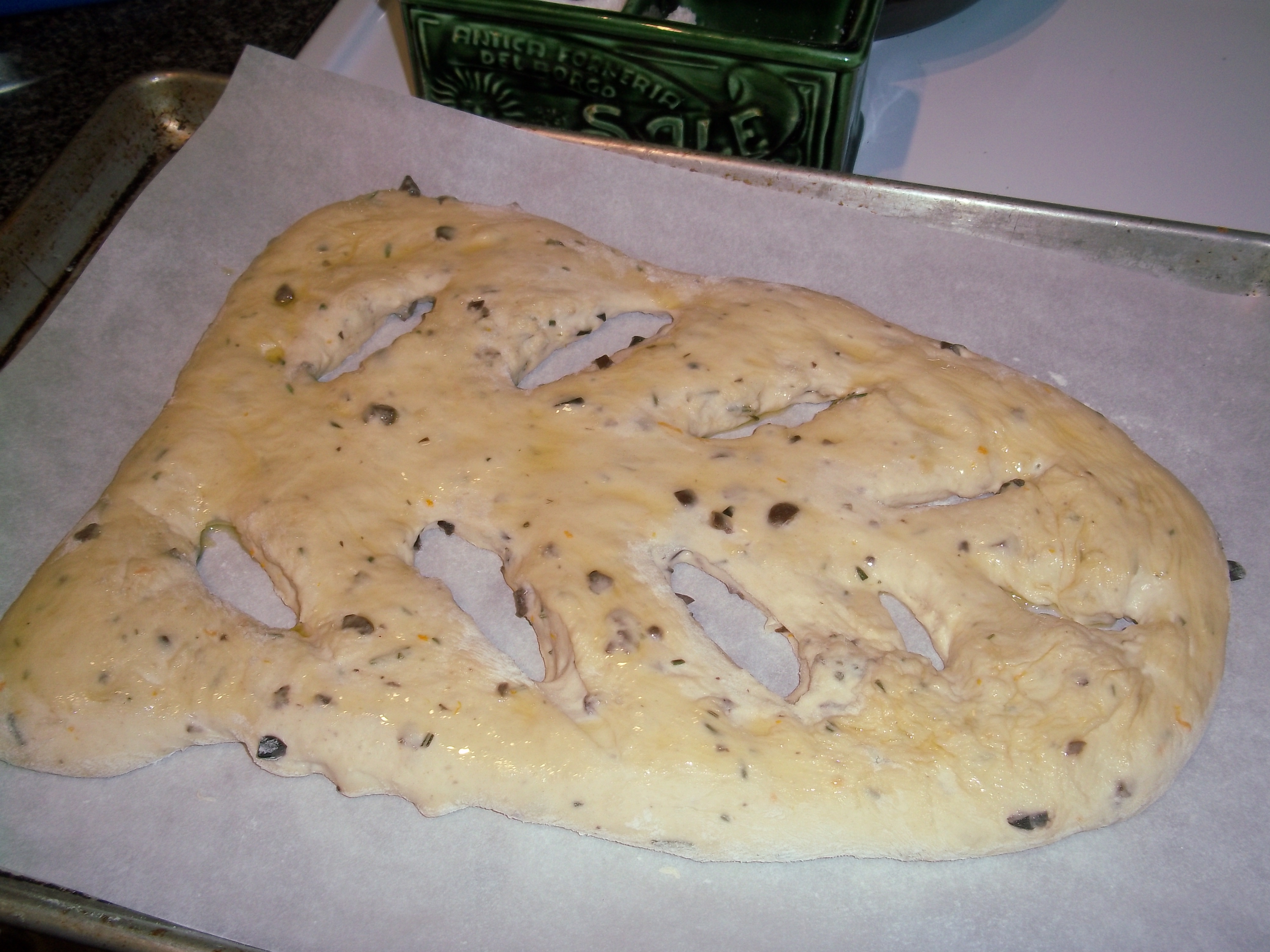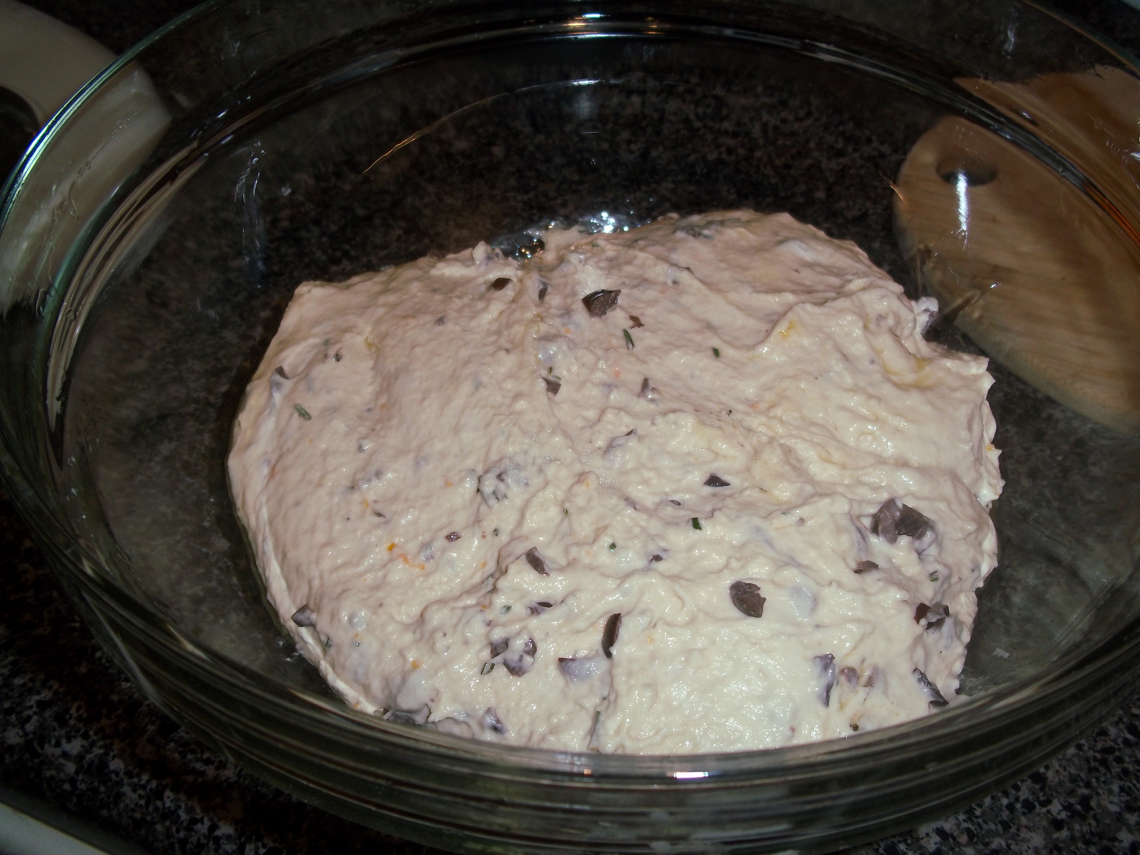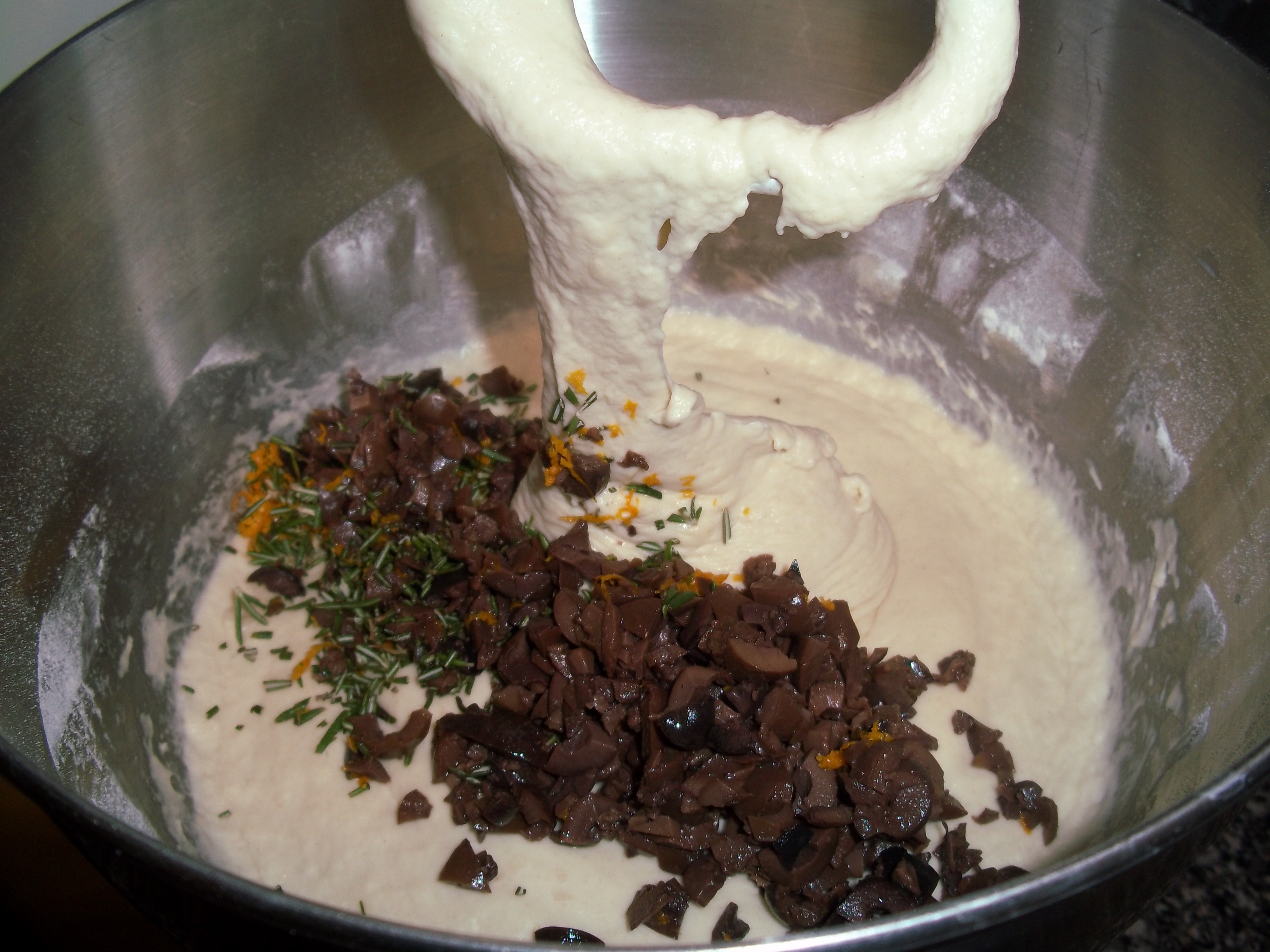 The flavorings for this are olives (I used Kalamata), fresh rosemary and orange (or lemon) zest. I love bringing rosemary home from up north where it really grows almost wild – lots of “volunteers” grow around the property. I decided to go with the orange flavor because I thought it would be new for me, though I know that olives and oranges are a classic combination. These ingredients are chopped and then mixed into the dough.