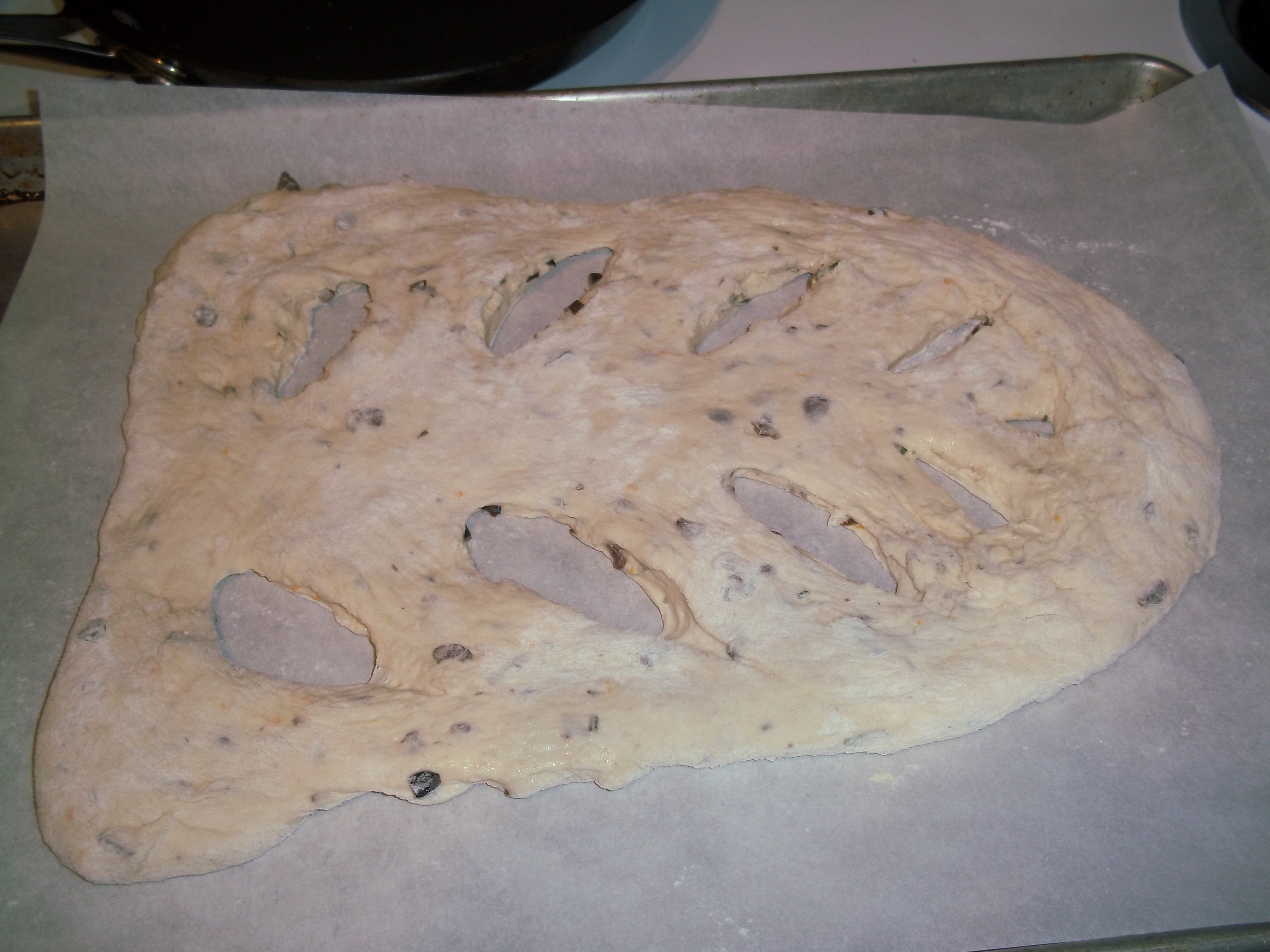 When you’re ready to bake (and this is one of the truly great parts – you need less than an hour until you have freshly baked bread!), you take half of the dough, and put it on a floured board. It gets patted out into a rectangle, then shifted over to a parchment-lined baking sheet. Once there, they get their iconic leaf-like slashes, a 15-minute rest, and then a nice brushing of olive oil (something flavorful is best here) and some coarse salt – I used gray salt with its lovely flavor.