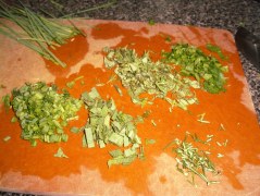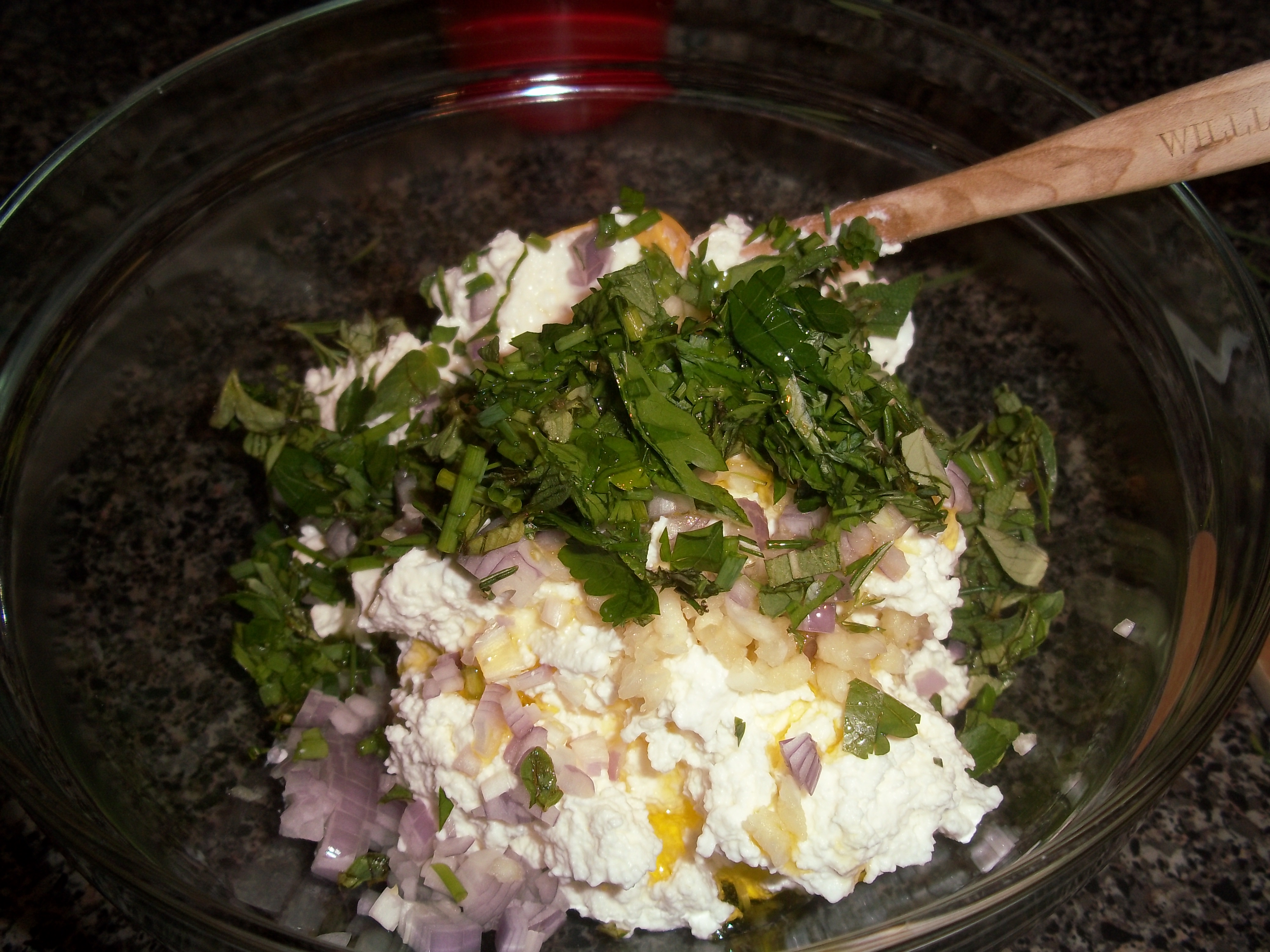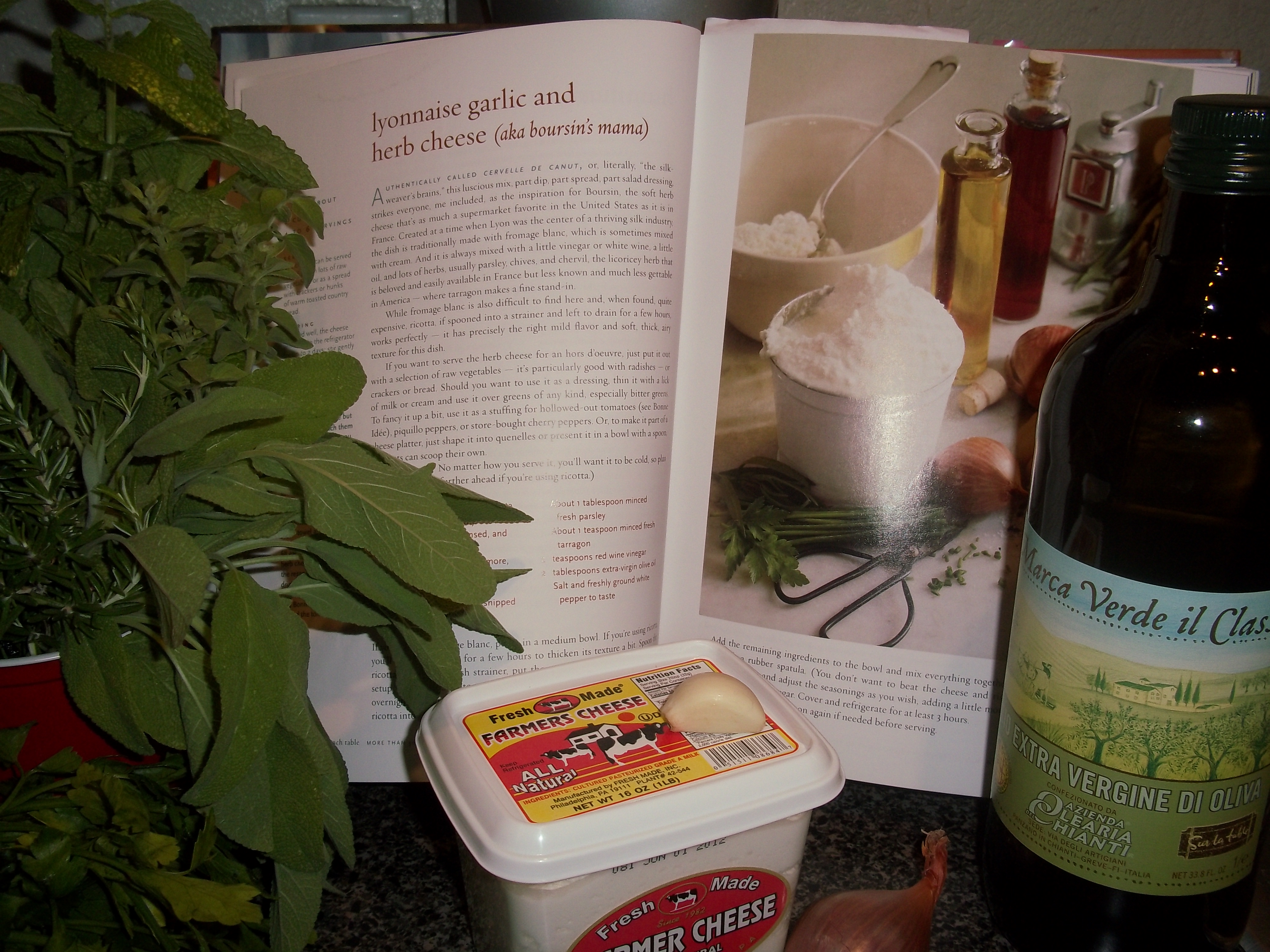 I thought that I’d remembered seeing some fresh cheeses, so when I stopped in, I bought some Farmer’s Cheese that’s actually made in PA. I guess that there are different  types, but this one seemed to be a soft consistency, so I thought I’d try it. The remaining ingredients are herbs (fresh from the garden up north), shallots, garlic, a bit of olive oil & vinegar and salt and pepper.