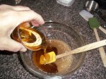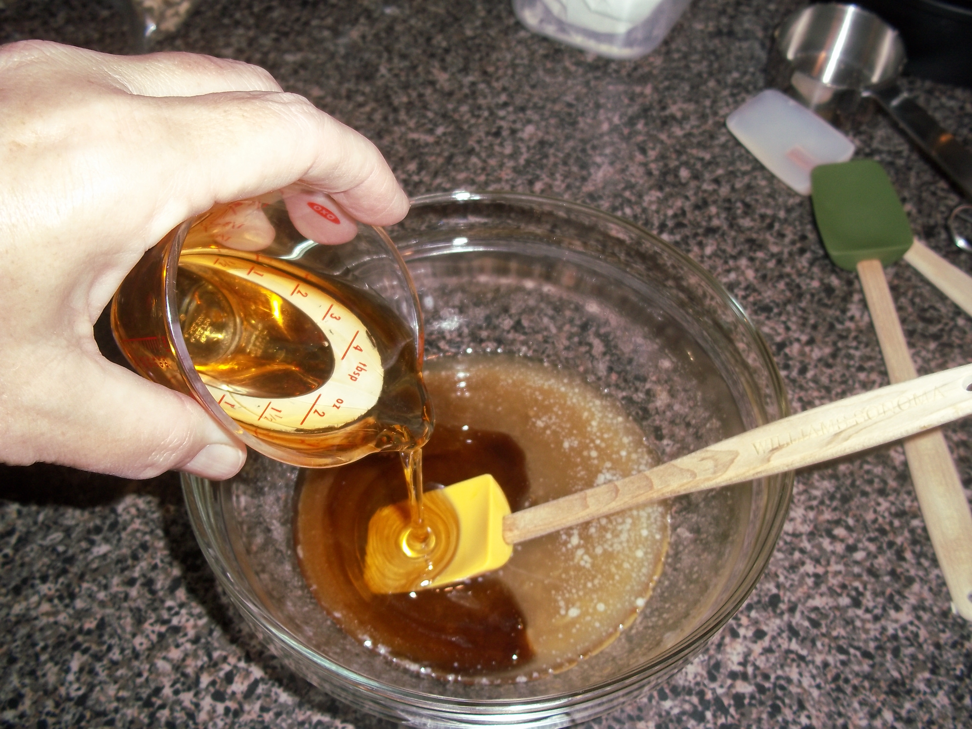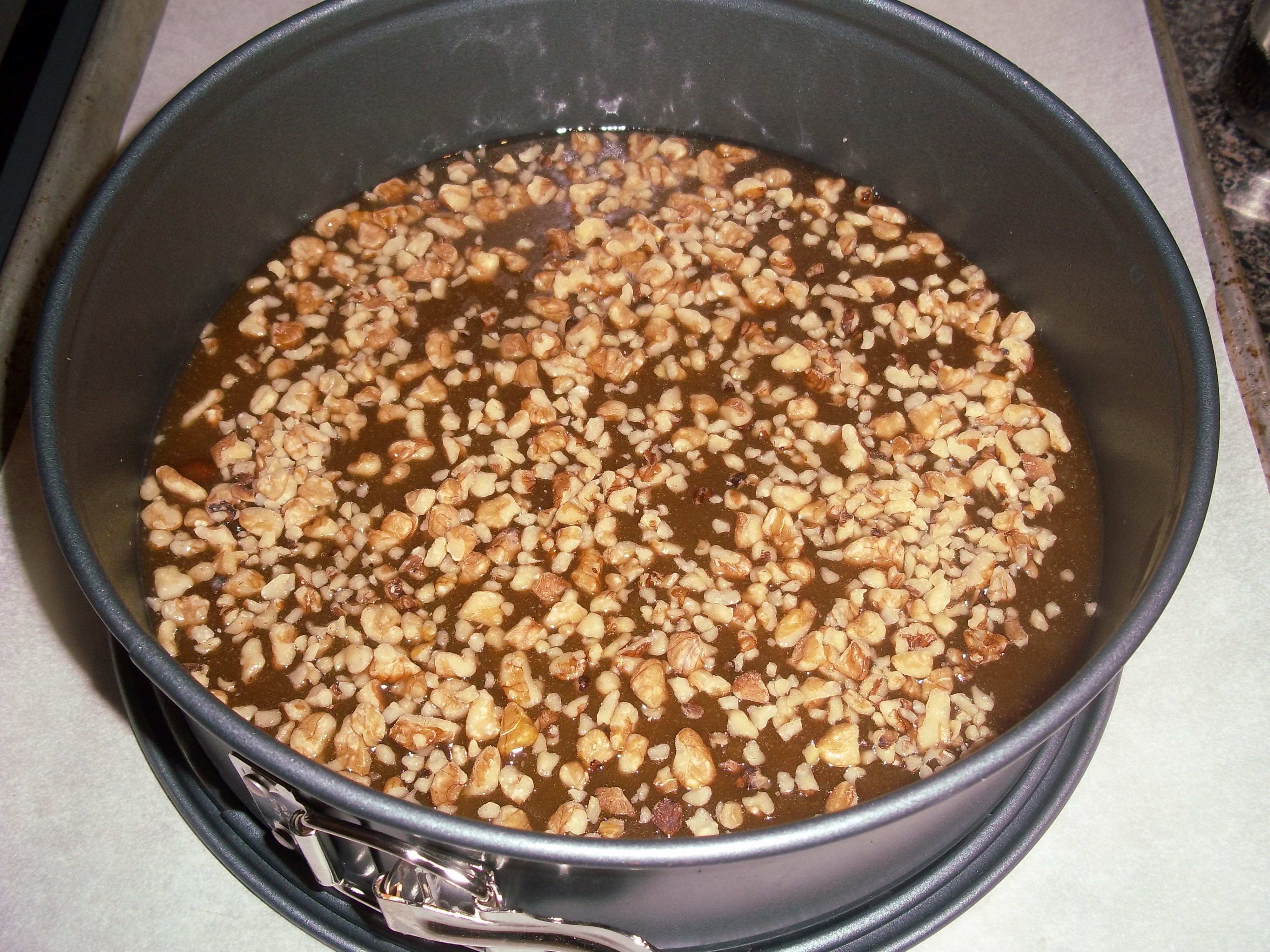 First, you make a buttery caramel sauce. Brown sugar and melted butter are combined, then syrup added – since this was a last minute thing, I ended up using a combination of maple syrup and corn syrup. I think that Lyle’s golden syrup would be good too. It all gets mixed together, and then poured into the prepared pan, then topped with 1/2 cup of chopped nuts. I decided on walnuts, though pecans would be good. Now that I think of it, macadamias would be good too… maybe with a bit of coconut. Anyway, you get the idea.