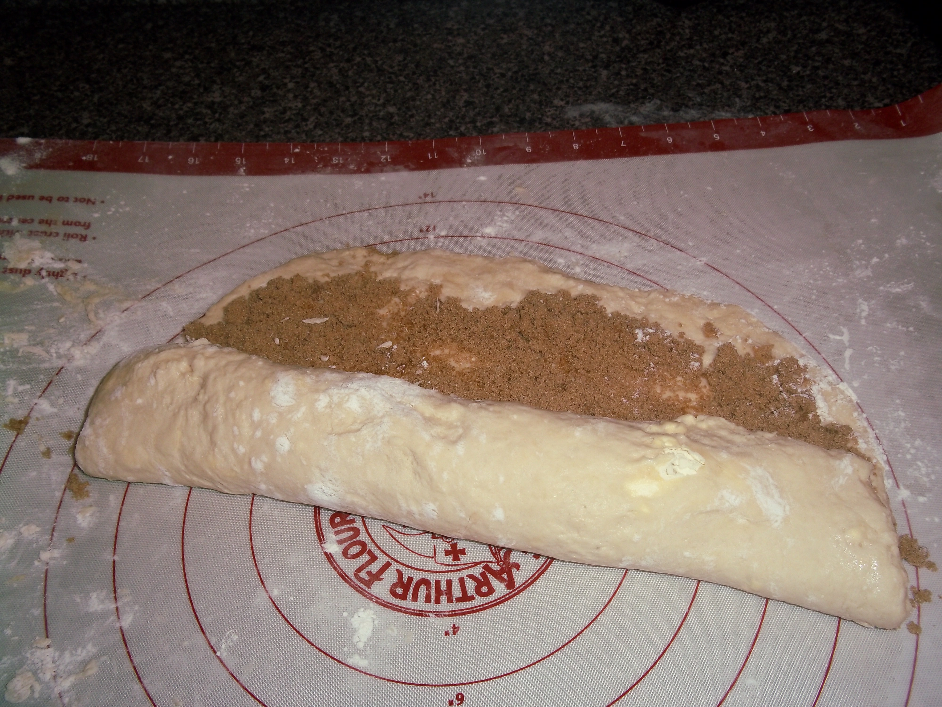 The dough gets kneaded on a floured board for a few turns. It was definitely soft, and needed the flour to finish it off. Also, I noticed that my buttermilk powder had clumped – it worried me, but I pulled out the biggest ones, and hoped for the best. The dough gets patted into about a 9″x12″ rectangle. It gets a bit of water brushed (or in my case, patted) onto it, then topped with 1/2 c brown sugar.