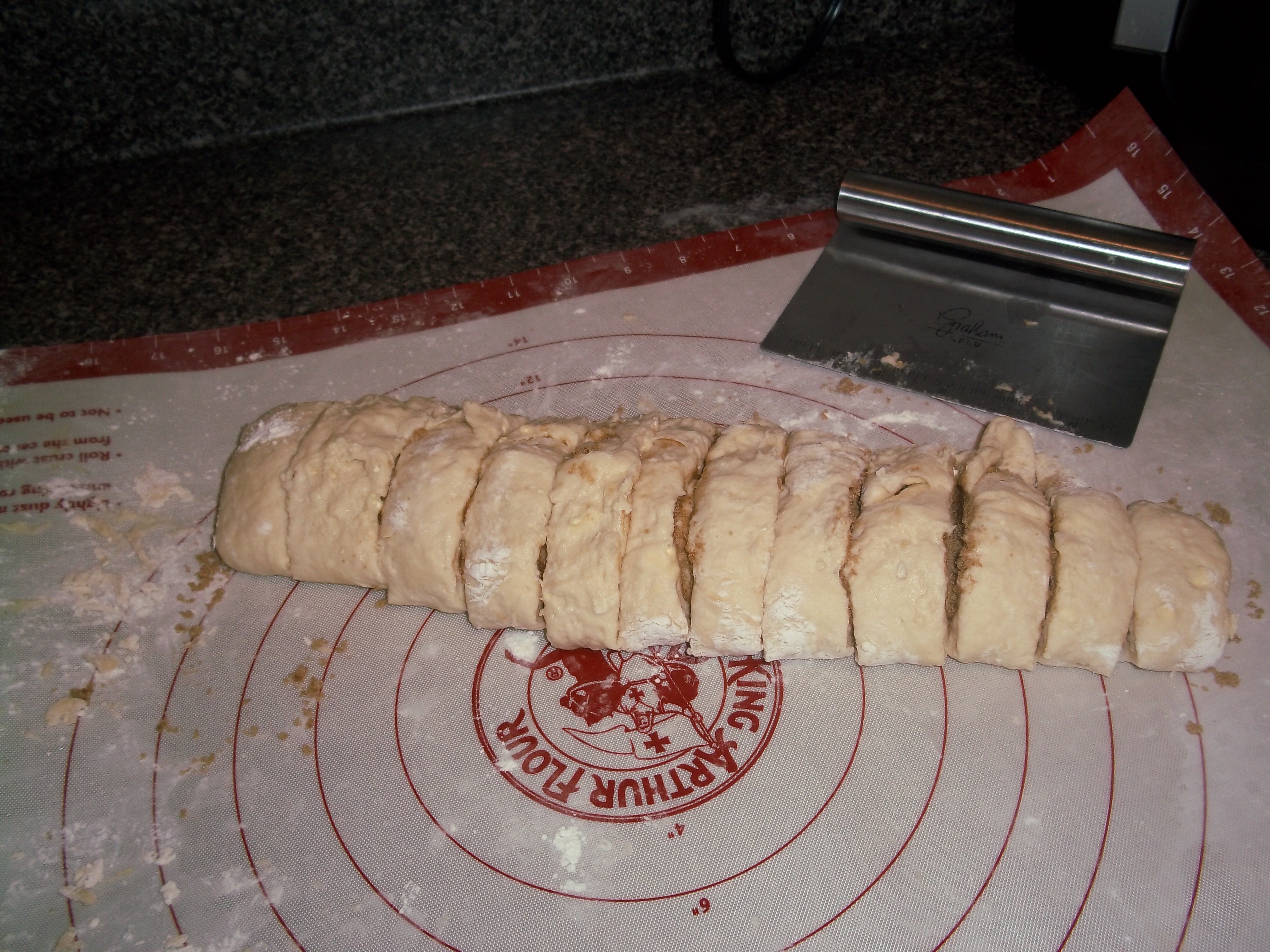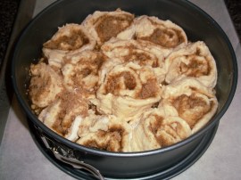 The recipe warns that it can get a bit messy from here, but I didn’t think it was a big deal. The sugar is spread out evenly except about an inch on one side. Then it gets rolled up, and cut into 12 pieces. The slices weren’t particularly the same size, but as it turns out it didn’t matter. I think the thickness was more important (I just cut it in half, then cut those pieces in half, then each of those in thirds – an easy division by 12).
