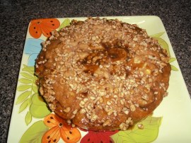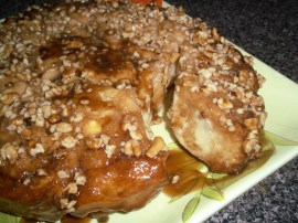 The rolls are to be inverted onto a plate almost immediately (I think they were precise – 5 seconds!) :). I used a plate with a bit of lip in the event that the caramel spread. It does make sense, the caramel quickly thickens, particularly around the edges. Use a spatula to get any caramel and nuts clinging to the pan and add to the top of the rolls.