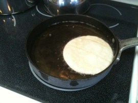 Next, heat the oil in a deep frying pan, preferably one that you use for that kind of thing – it gets messy, and can be difficult to clean if you fry a lot of tortillas. Once that’s started, get the tortillas out. In the center of each tortilla (I do this with a stack of around 6, just to make it faster), push the skewer through to create a hole. You can also cut one with the small hole of a cake decorating tip, or even a straw, but I prefer the skewer, since it’s small and tends to make the tortillas easier to thread onto the wire. It does not work to put the holes in once the tortillas have been fried.