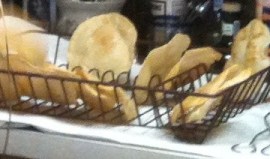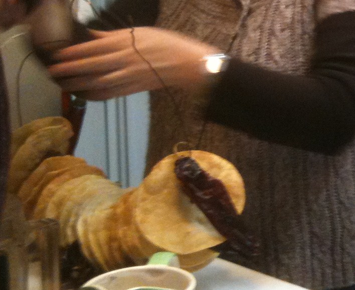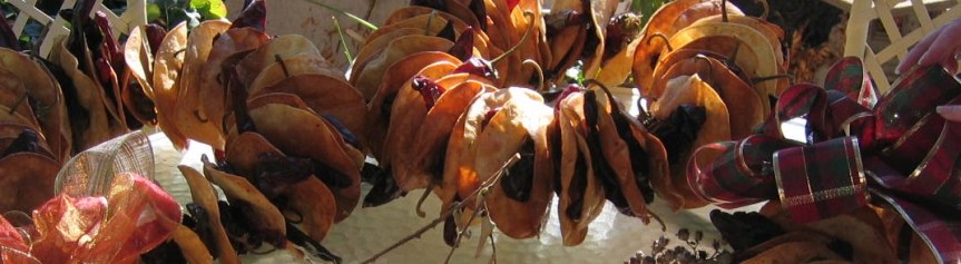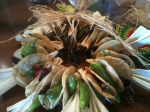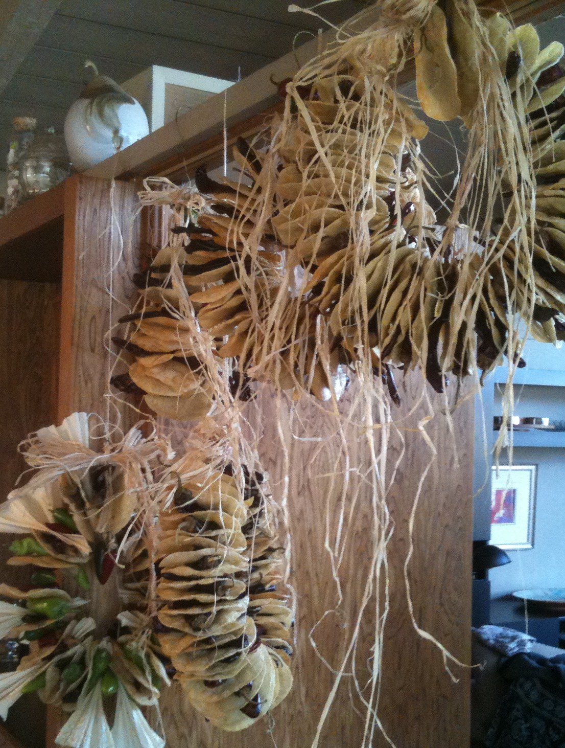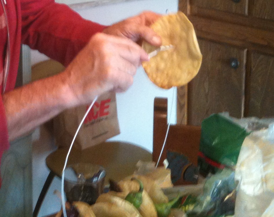 These make great, inexpensive gifts, and are a fun choice for a southwestern decoration. The one caution about hanging the wreath indoors – the oil can migrate (particularly when it’s just been created) to a wall that it’s resting against, or even drip on the floor if the tortillas were not completely drained, so beware, and plan accordingly. The wreath will last for a couple of years, if it’s not broken too much, but don’t plan on much longer than that. Of course, they are easy and fun to make, so it’s not a lot of trouble to re-create one if you need to.