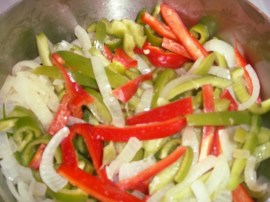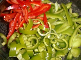 While the onions simmered away, the peppers needed to be prepared. OK, so this time I just did my normal “cut sections off of the pepper around the core, then slice” method for the bell peppers, and then cut half-rings from the Anaheim chiles, since it seemed that it would give me more uniform slices.
