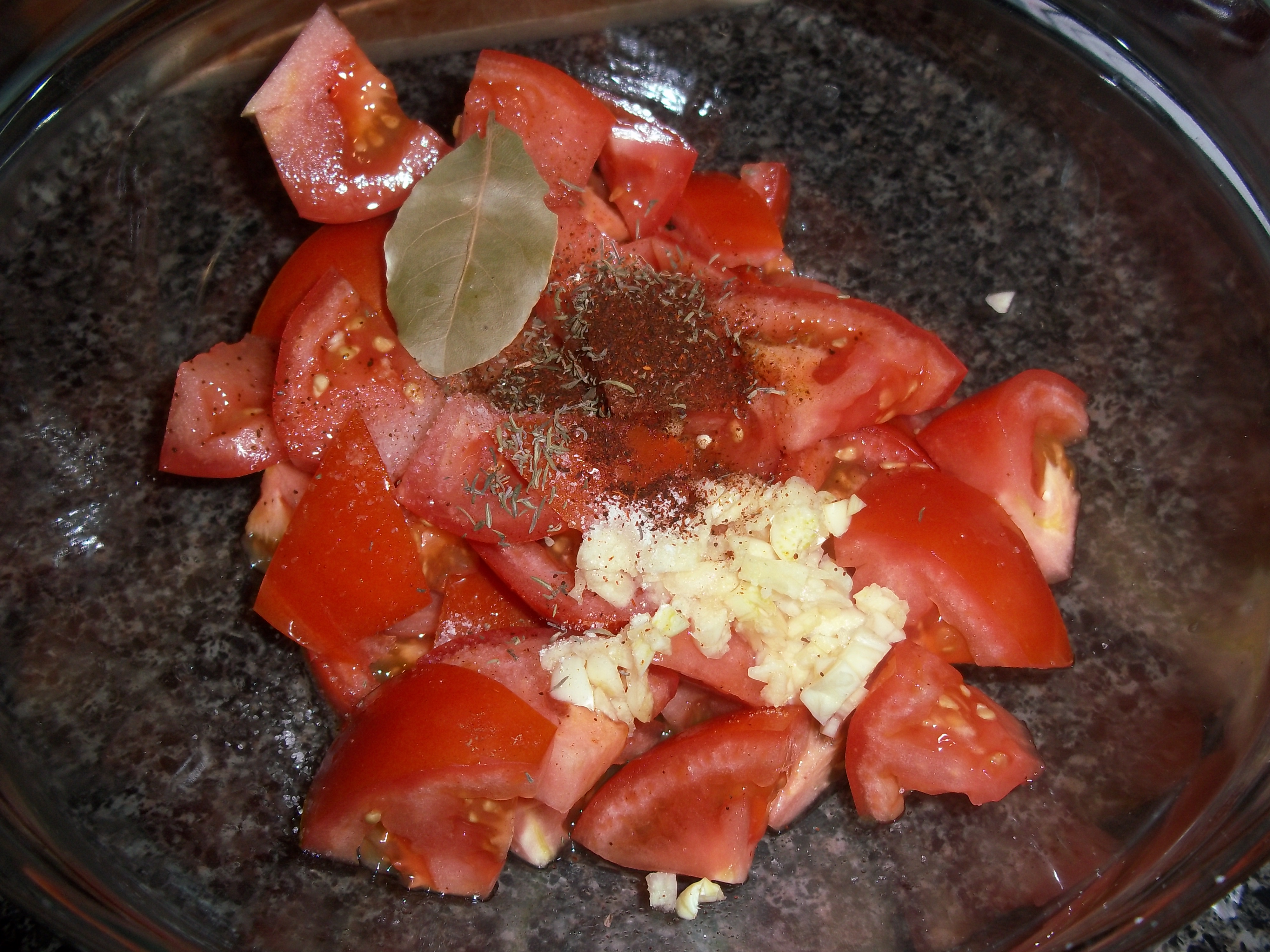 The other ingredients of the dish are then prepped so that once the long, slow simmer of the peppers, they can be added, and those flavors can layer into the mix. Tomatoes, garlic, bay leaf and some seasonings. I haven’t yet found Esplette pepper, so I chose some ground Ancho chile, since it’s flavorful, yet not very hot.