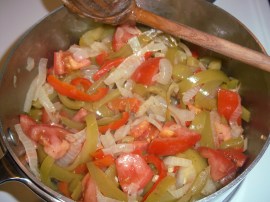 “Piperade (Gascon) or Piperrada (Basque), from piper (pepper in Gascon and Basque) is a typical Basque dish prepared with onion, green peppers, and tomatoes sautéd and flavoured with red Espelette pepper. The colours coincidentally reflect the colours of the Basque flag (red, green and white). It may be served as a main course or as a side dish. Typical additions include egg, garlic or meats such as ham. This is a traditional French dish and is served in restaurants and cafés throughout France”
