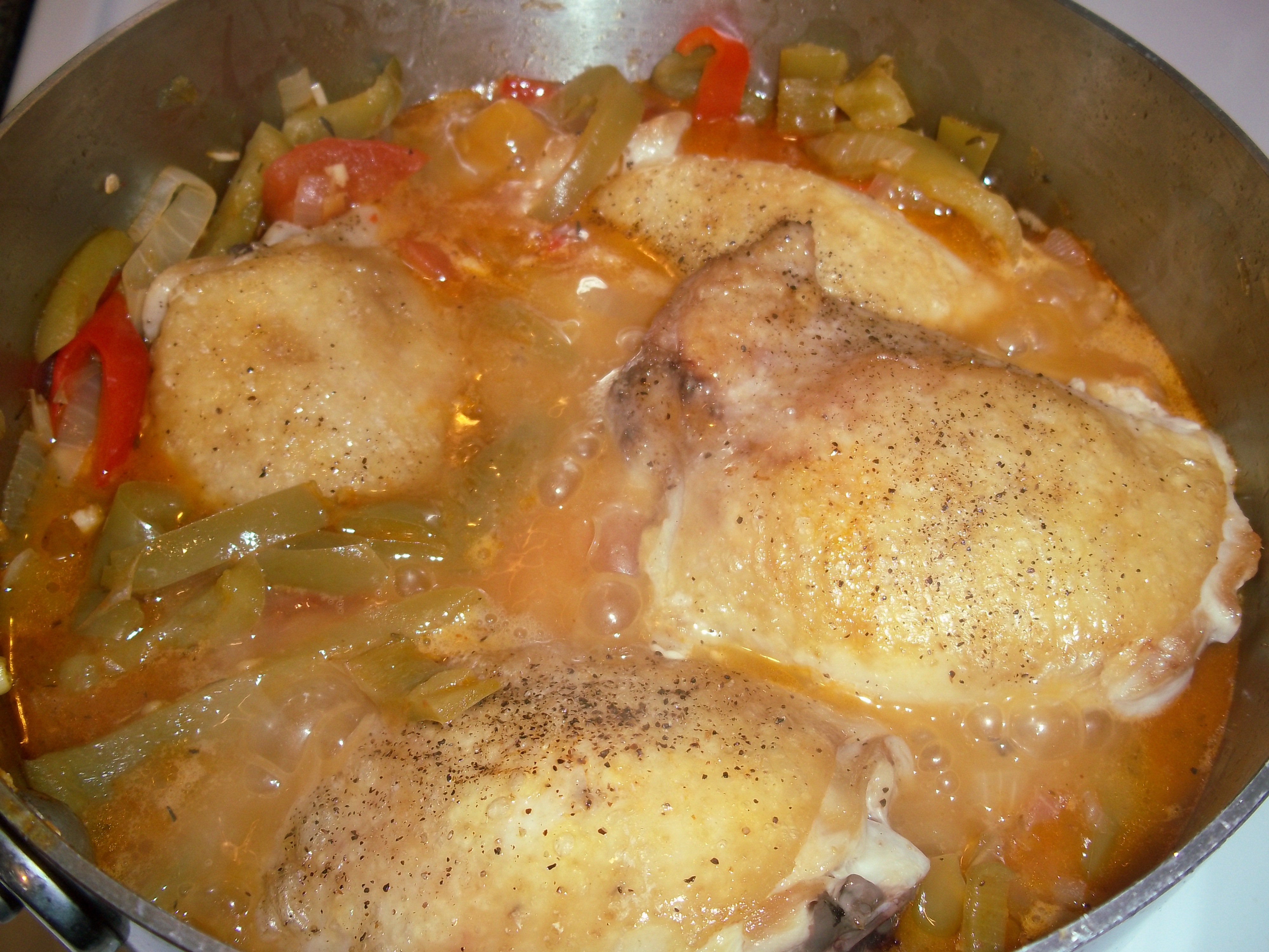 While that finishes cooking, the chicken is browned, then the pan is deglazed with some white wine, then it’s added to the simmering piperade, covered and allowed to cook until the chicken is tender.
