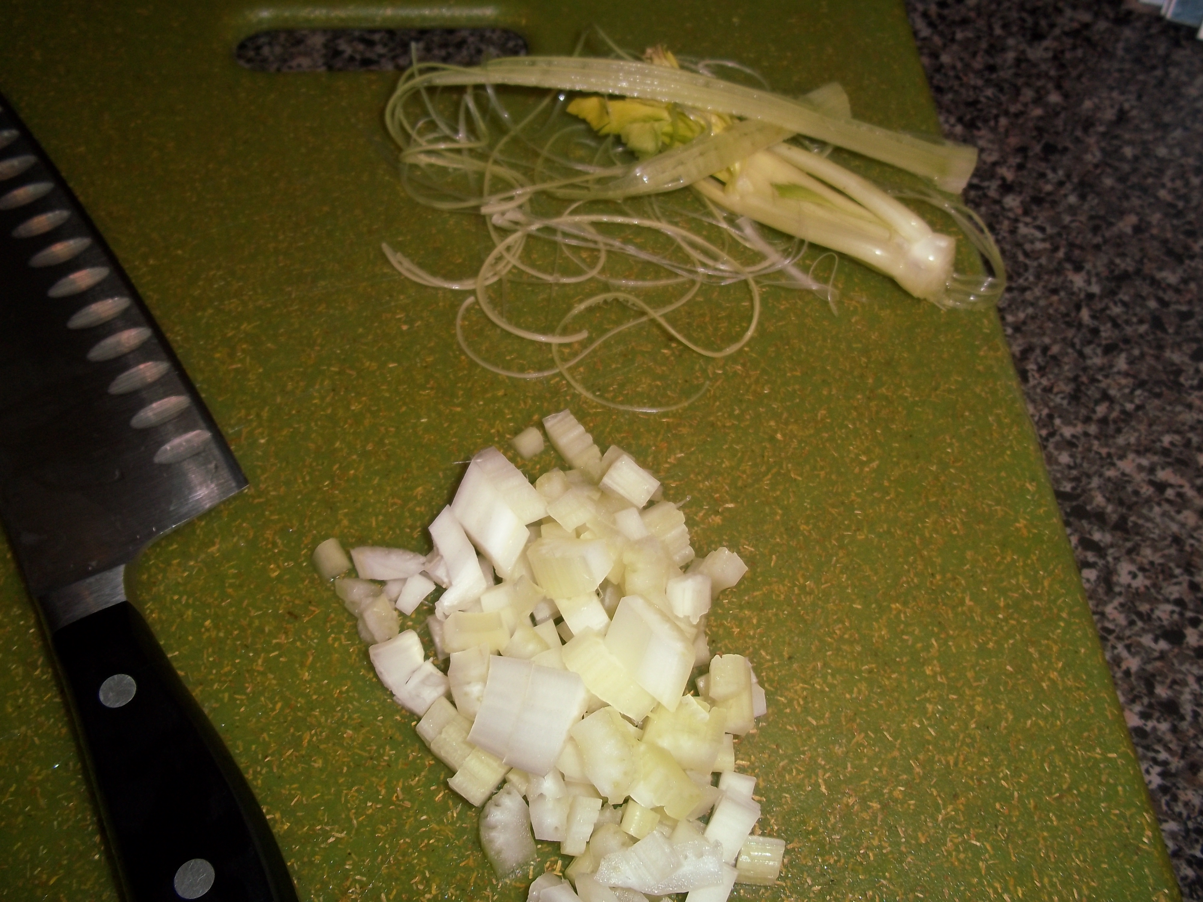 Unfortunately this time I didn’t have any fresh herbs on hand, so this really was a “pantry” kind of recipe. The vegetables all get prepped. One of the things I can totally get behind is Dorie’s method of prepping celery. My mom does this too – stripping all of the strings out of it so that it’s not tough. That way you can enjoy the flavor more. Once prepped, they get tossed in a bit of olive oil or butter in the soup pan.