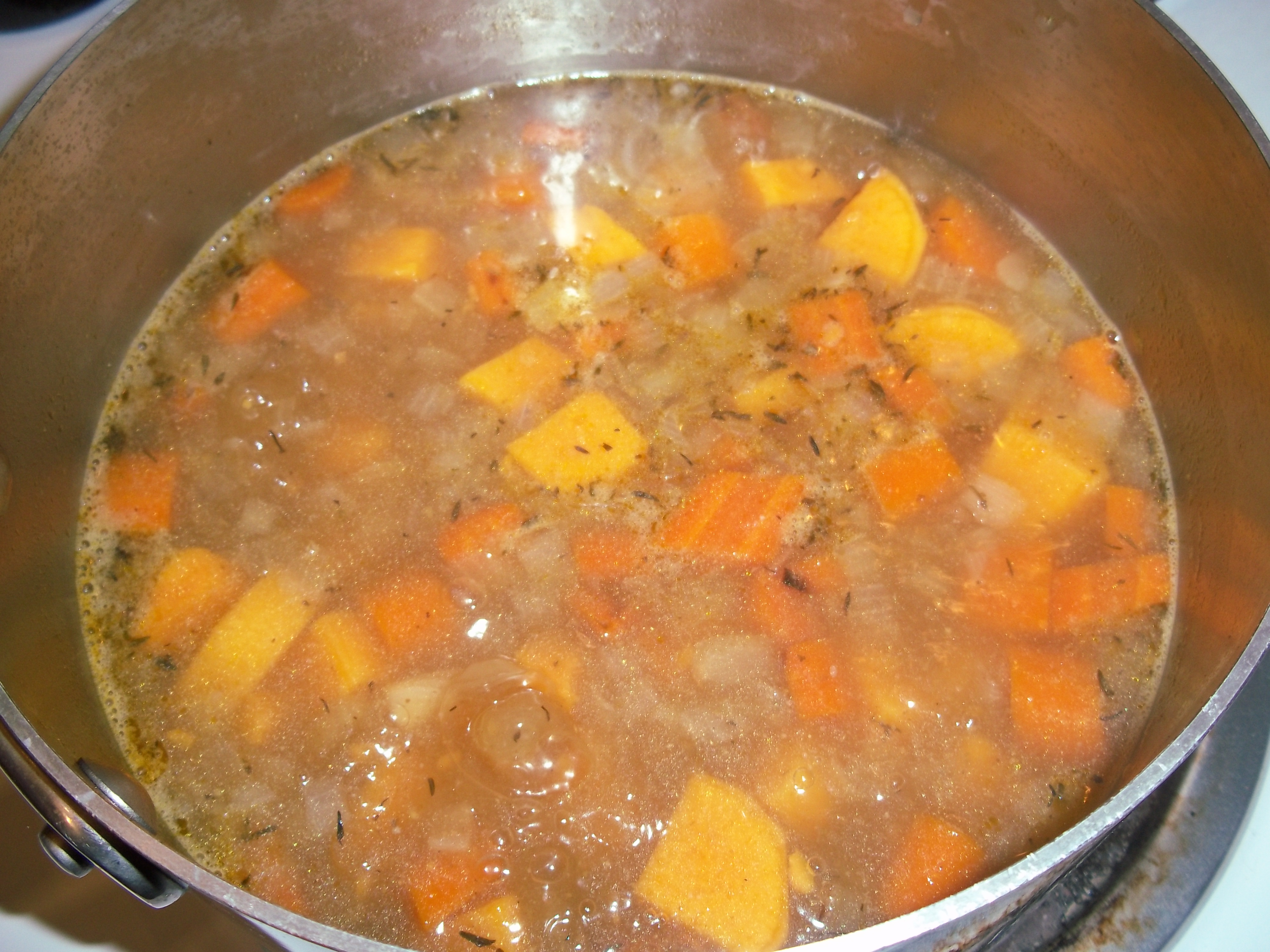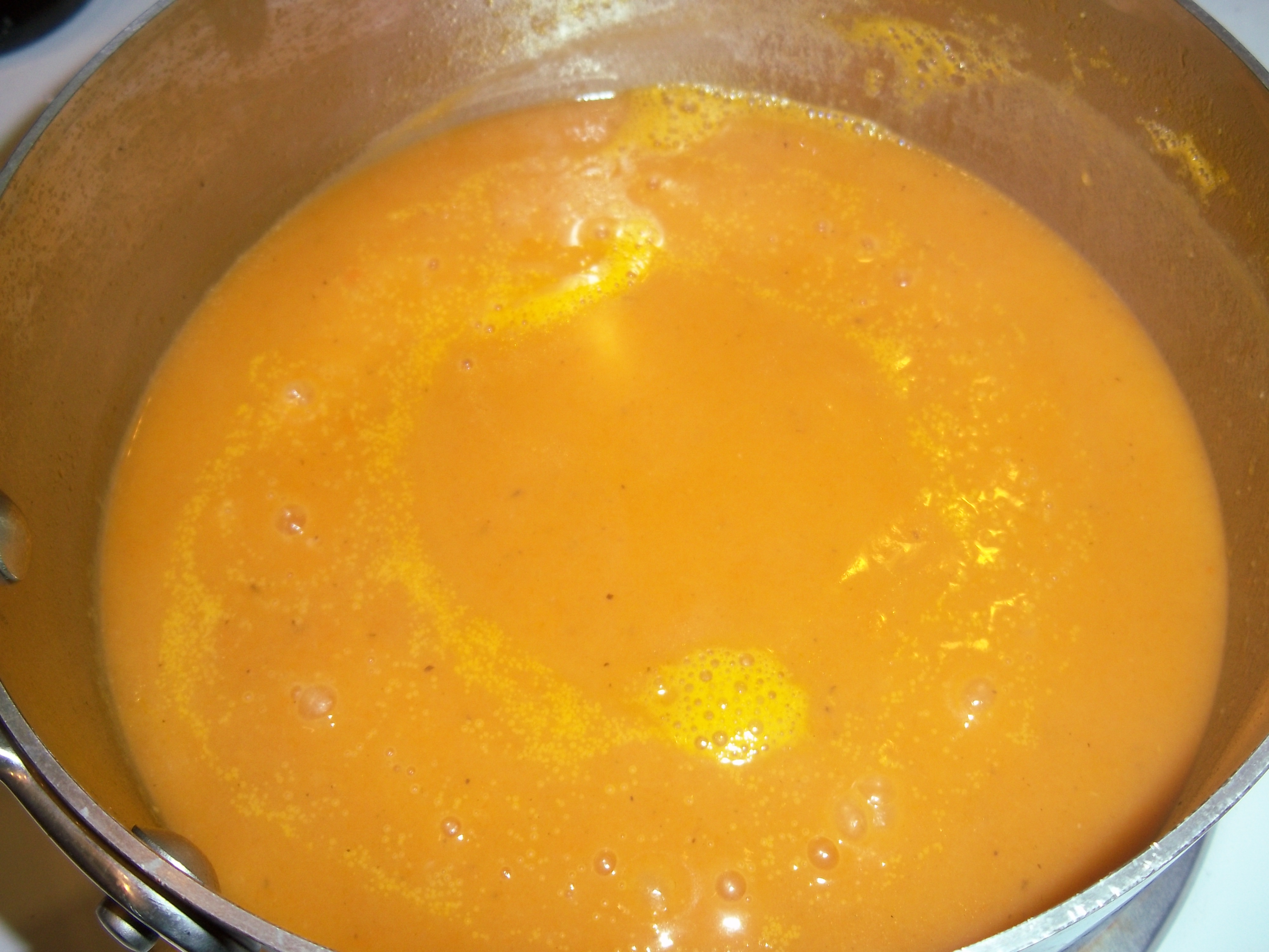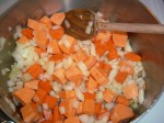 From here, the veggies and flavorings get covered and cook slowly for a bit to soften (I used some chipotle here to spice things up). I have to admit that I must have gotten sidetracked while doing this – the vegetables shouldn’t get browned – mine got a bit more than that and had to be rescued! 😦 Once through that process, the stock is added and cooked until the vegetables are soft, and then I used my immersion blender to make a smooth soup.