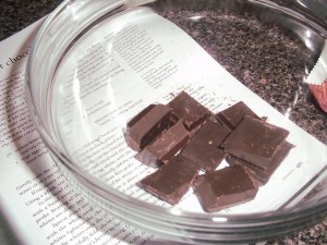 Since Dorie’s story goes that this recipe came from the back of a bar of chocolate, I can’t imagine that I’ll get in too much trouble by providing you the ingredients here: 3.5 oz of bittersweet chocolate, 3 eggs, pinch of salt and 1.5 t sugar. I thought – wow, so simple, and really not that bad for you (if you subscribe to the idea of dark chocolate being a super-food).