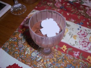 Not the best photo, but you can see – presented with just a bit of whipped cream on top. The consensus was that it was delicious. A very decadent shot of chocolate. I still think it could have been a bit lighter, but it was a great ending to a simple meal.