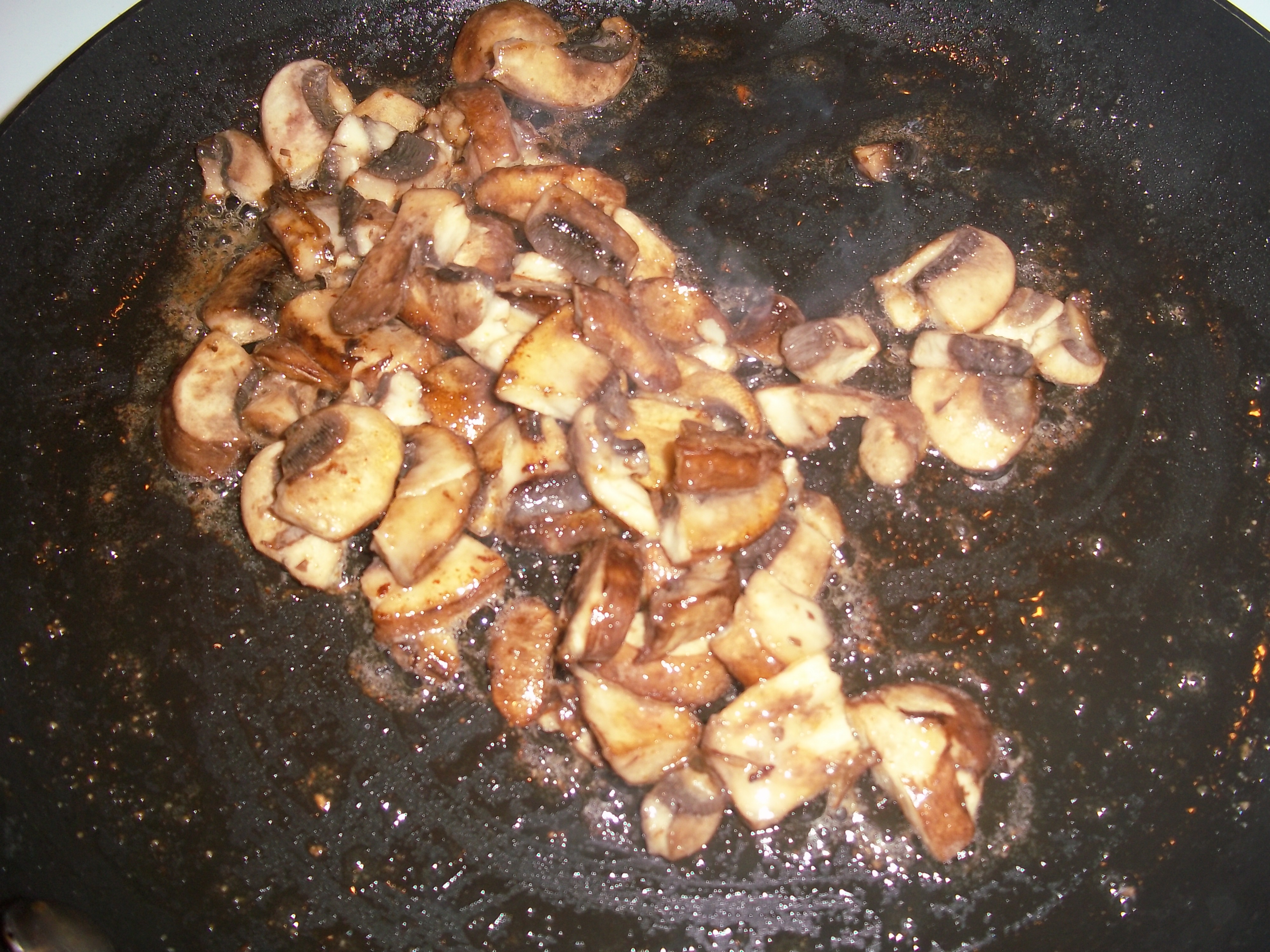 I probably should have just stuck with the recipe as written. I’m sure that the broth and mushrooms would have been terrific (particularly if I’d had those fresh herbs!). But someone mentioned something about cheese… and I just happened to have some lovely freshly-grated Gruyere sitting in my refrigerator begging to be used. So instead, I did saute mushrooms, then made a bit of a cream sauce with them.