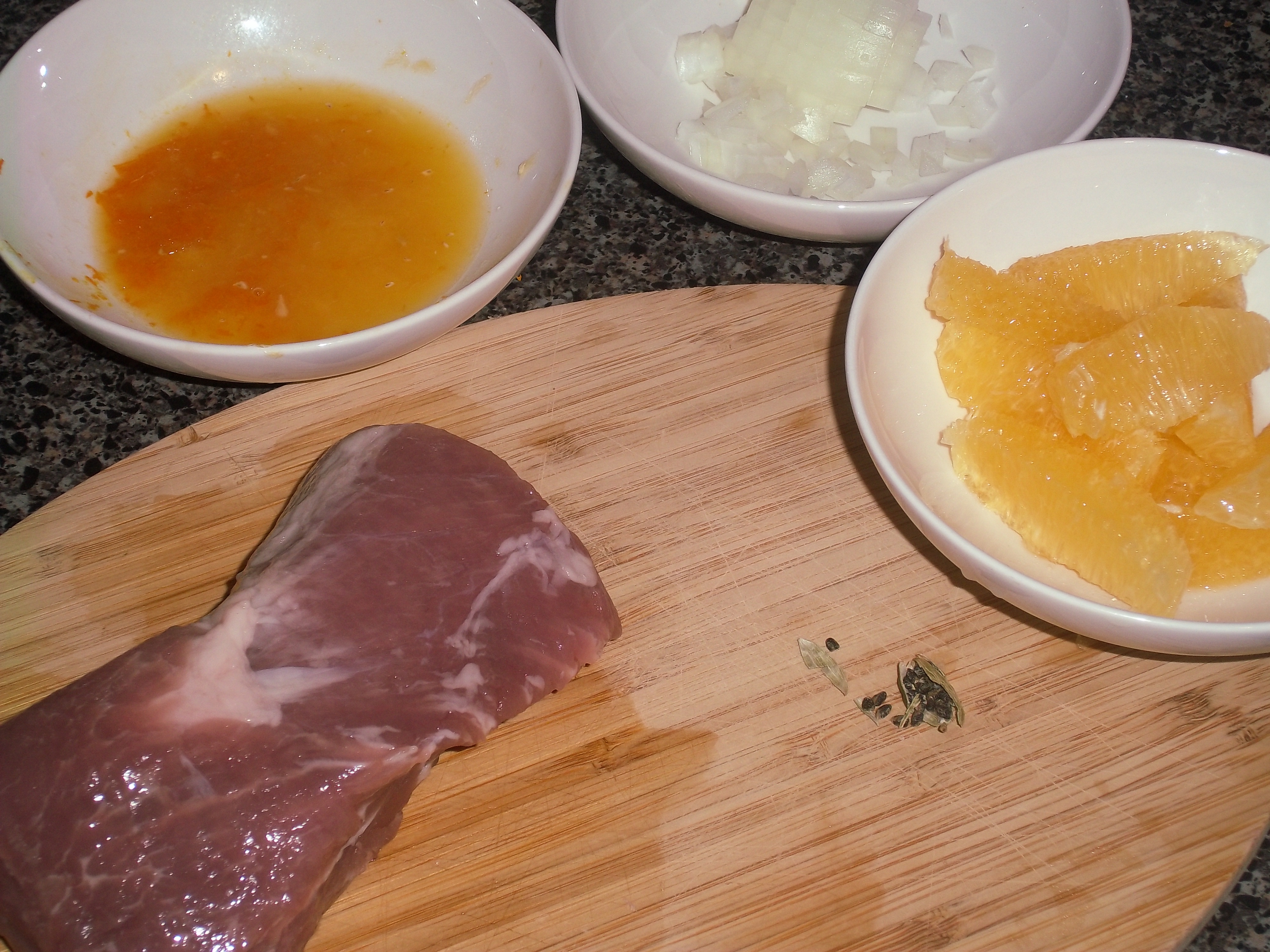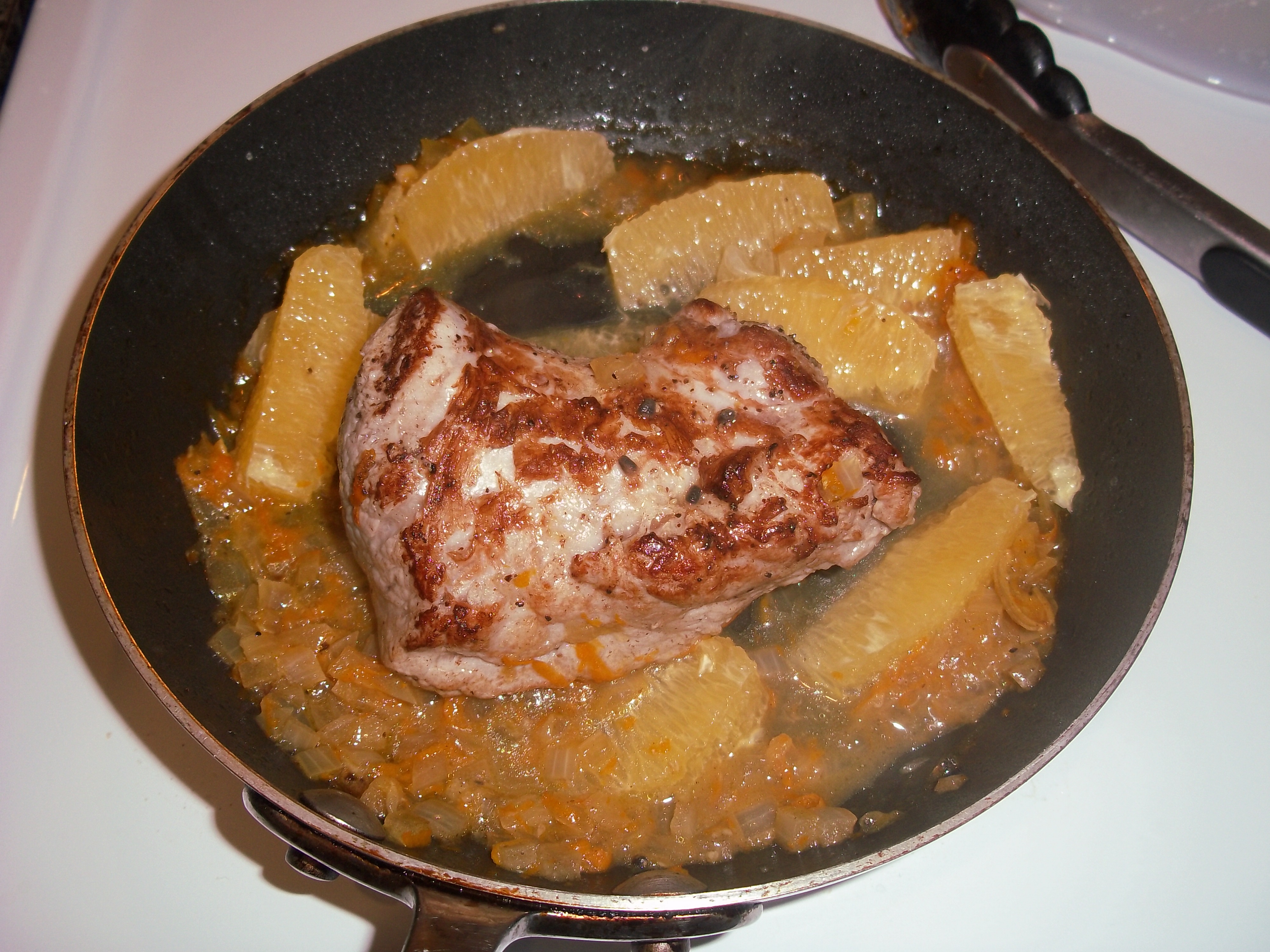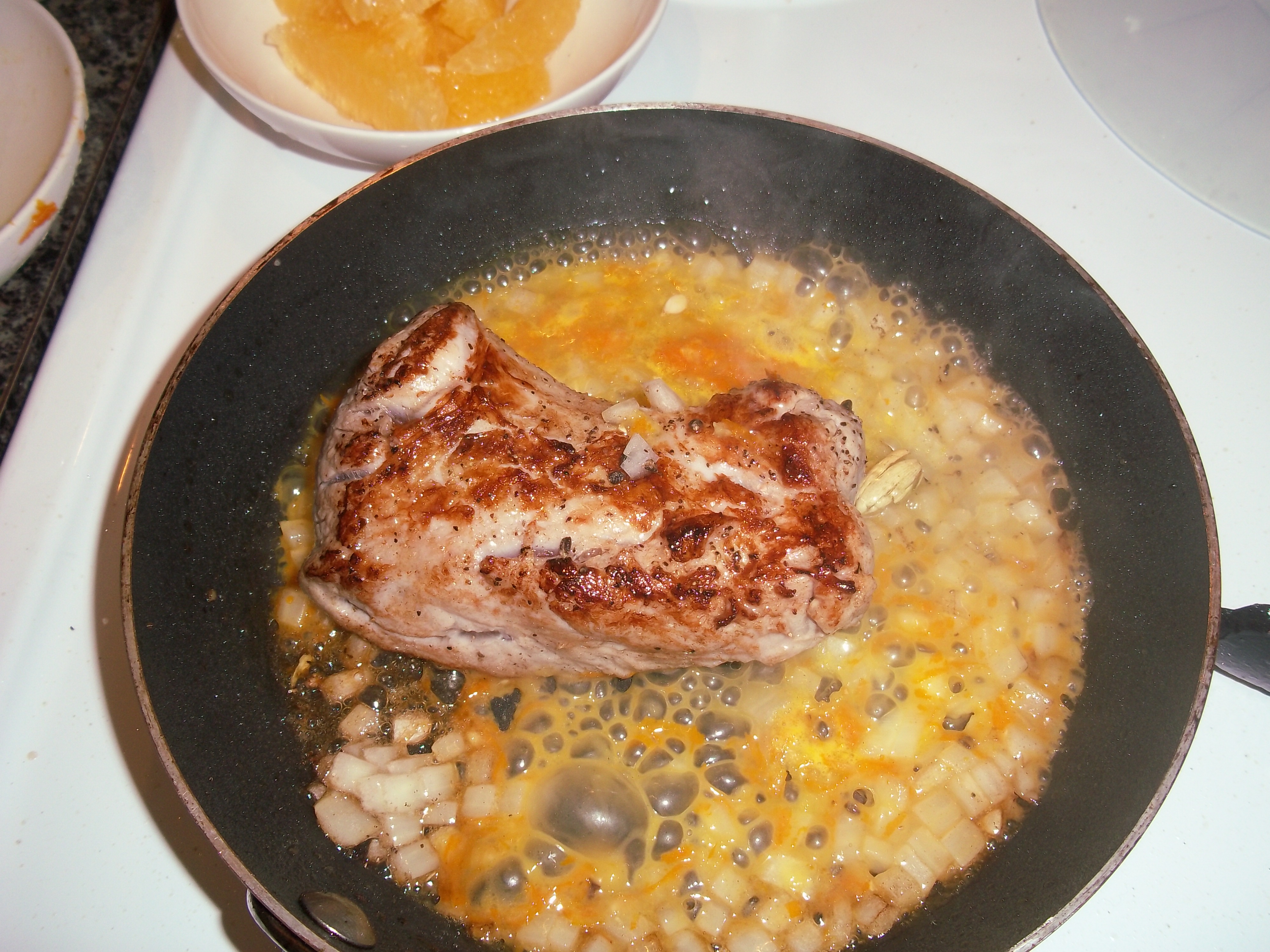 I prepped everything – the orange segments, the juice, zest, a bit of onion and cardamom. To start with, I kept my tenderloin in one piece. I try not to actually look at other’s posts and comments, so that I actually learn something on my own, but this time, I did. The pork is browned, the onions added, then the cardamom, juice and zest. This is all covered for about 10 minutes, then the segments or supremes are added, then simmered for a bit more. Mine needed a bit more cooking, but not too much longer. I was pleased that the juice didn’t evaporate, and made for a nice bit of sauce