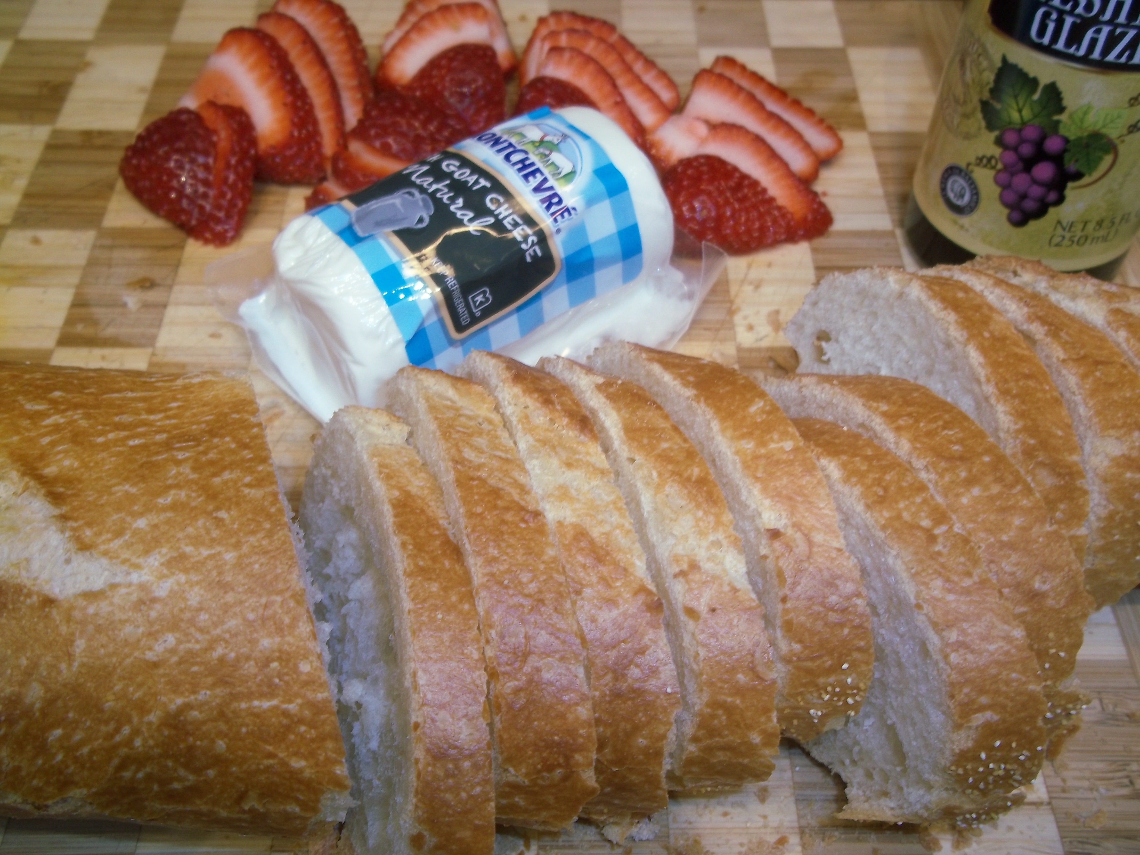 A fresh baguette, soft goat cheese, flavorful strawberries and a balsamic reduction. OK, so I threw in a little fresh black pepper.