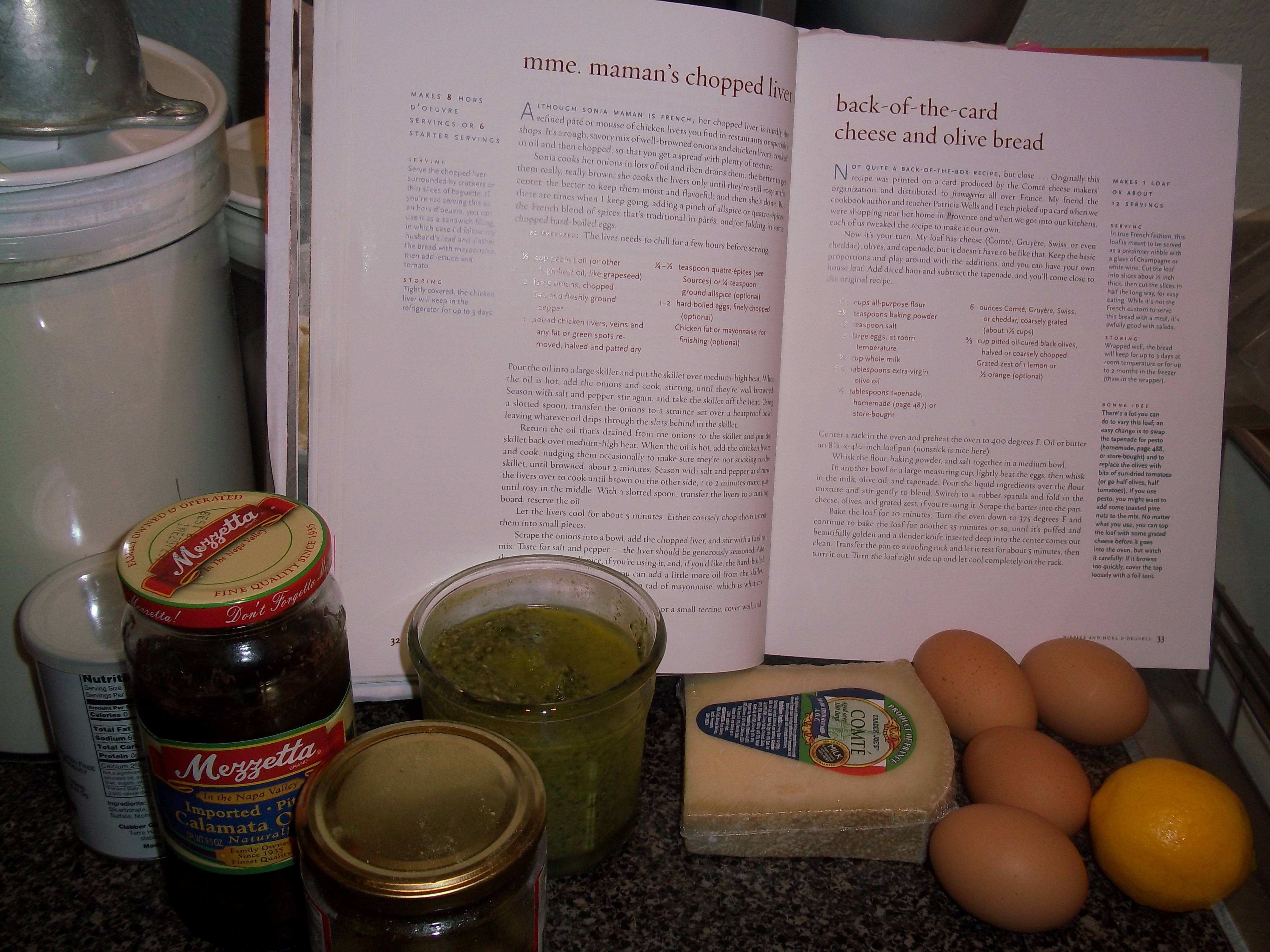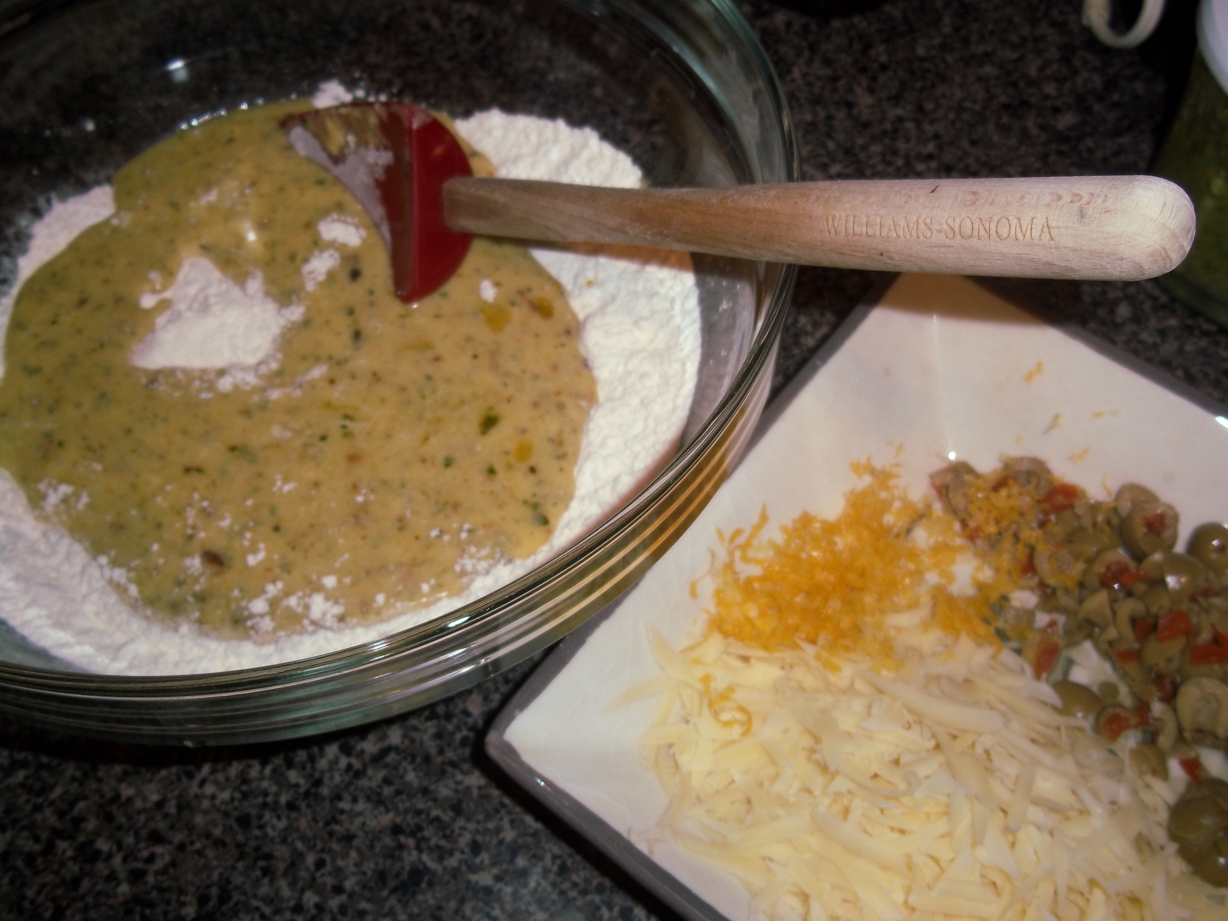 At it’s heart, this is a quick bread with “additions” – savory ones. I managed to finally round up some comte cheese (one of my favorites, having been introduced to it by Dorie), assuming that I’d have olives around, and probably some tapenade. Well, I do have olives, but almost only ones with pits. That seemed like an excessive amount of work. So I did scrounge up some green ones, homemade pesto (sans cheese for the vegan portion of my day) and a meyer lemon for the optional zest. I even decided to use some of my pistachio oil in this (including pieces of nuts).