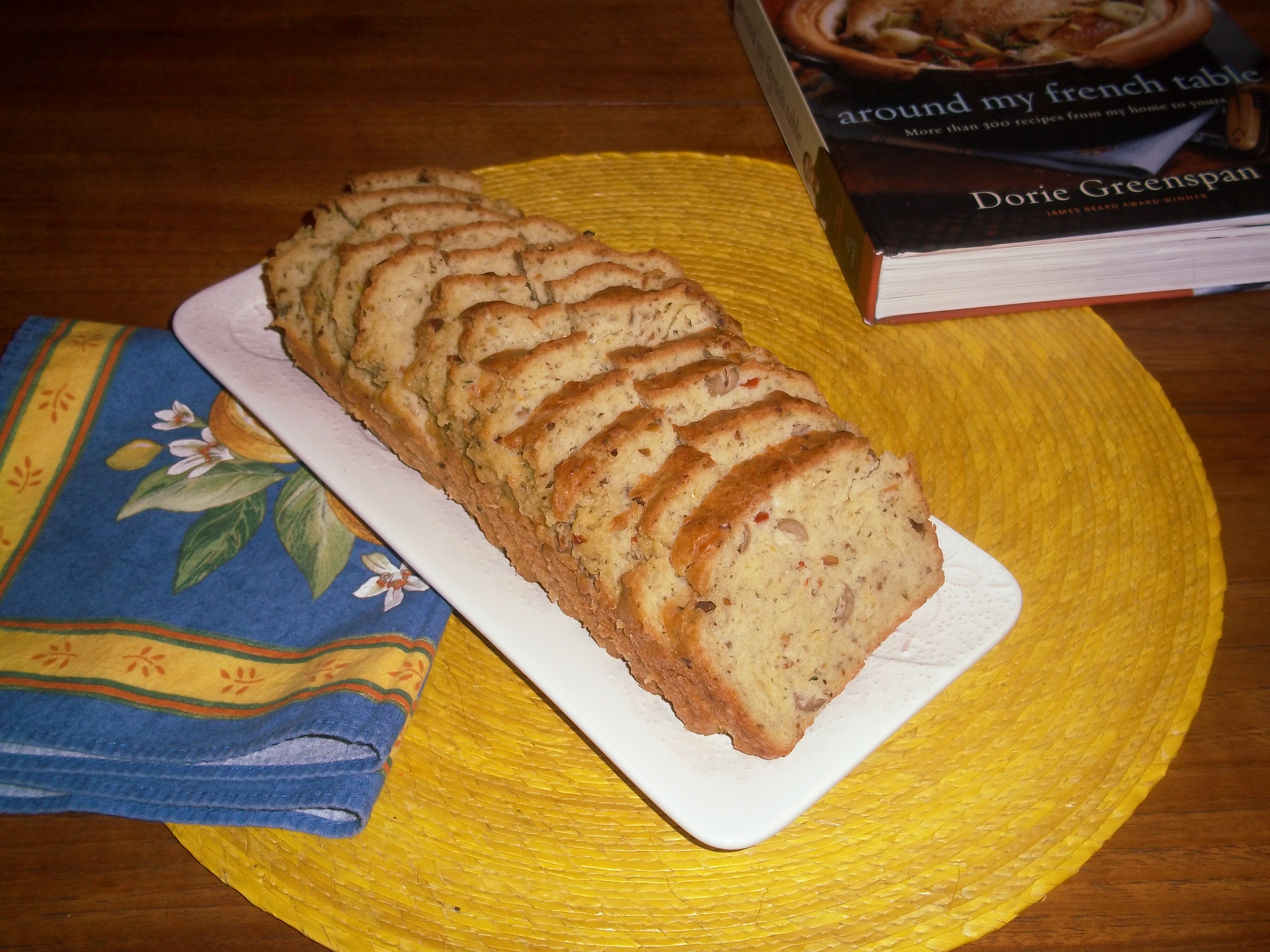 I made this loaf according to Dorie’s exact directions. Right now I am so intimidated by baking in the high altitude that I don’t want to verve off the road. However, as you pointed out, with a quick bread, that’s really not a problem. I liked this and took it to a dinner party. But, I think it’s probably best served, as Dorie suggested, as a nibble with wine or, as Susan suggested, as the makings for a grilled cheese sandwich. I think your loaf looks really tasty and I sorta like the addition of nuts.