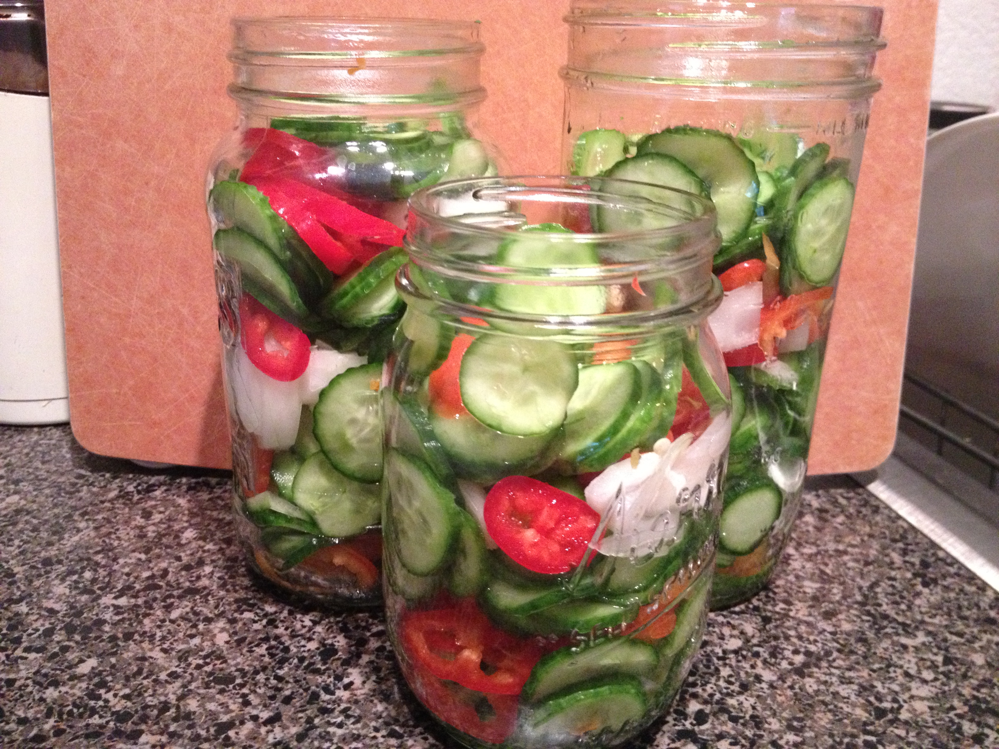 For my first batch, I ended up with way more jalapenos than I thought – so there’s one jar that is mainly jalapenos. To be honest, I’d forgotten how much hotter the jalapenos from this farm are than regular ones from the store. So they were spicy! I had one jar with no jalapenos and added dill, and then the other two had a combination of mainly cucumbers with a few of the other vegetables. Let me just say, they went pretty quickly. I found myself making up excuses to eat them!